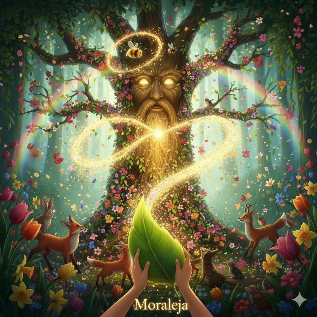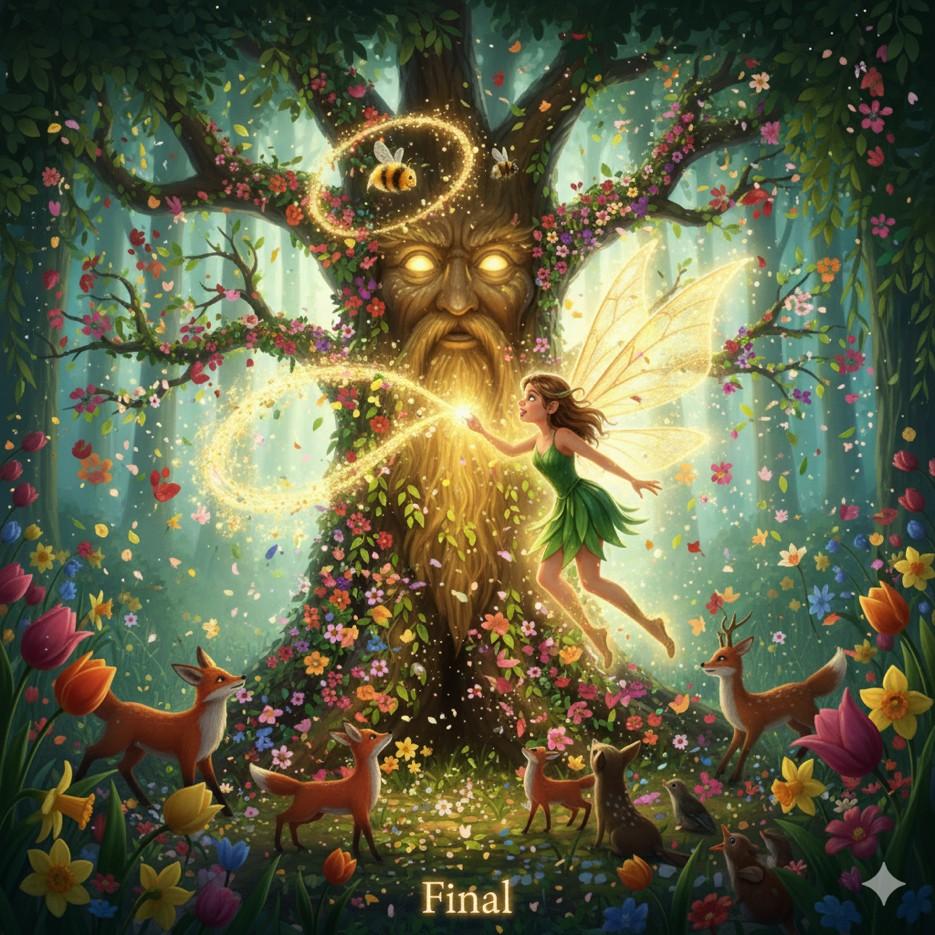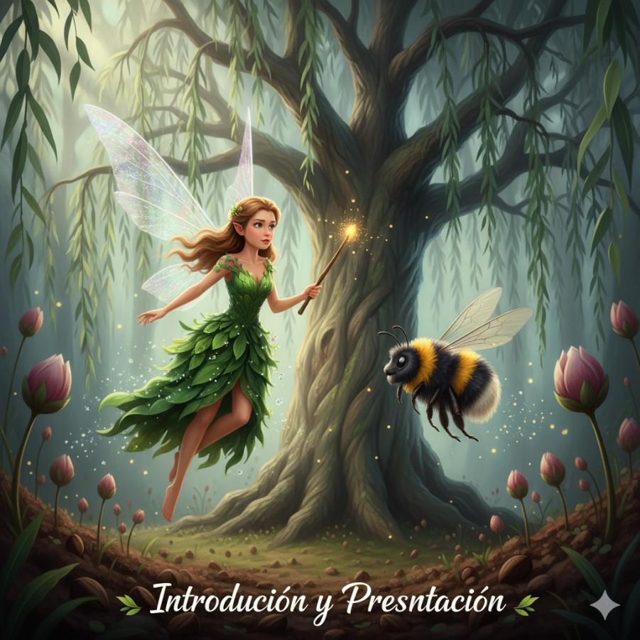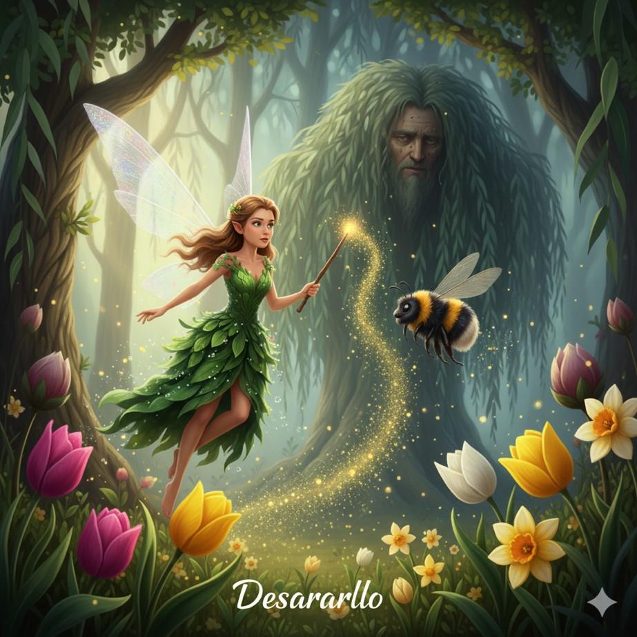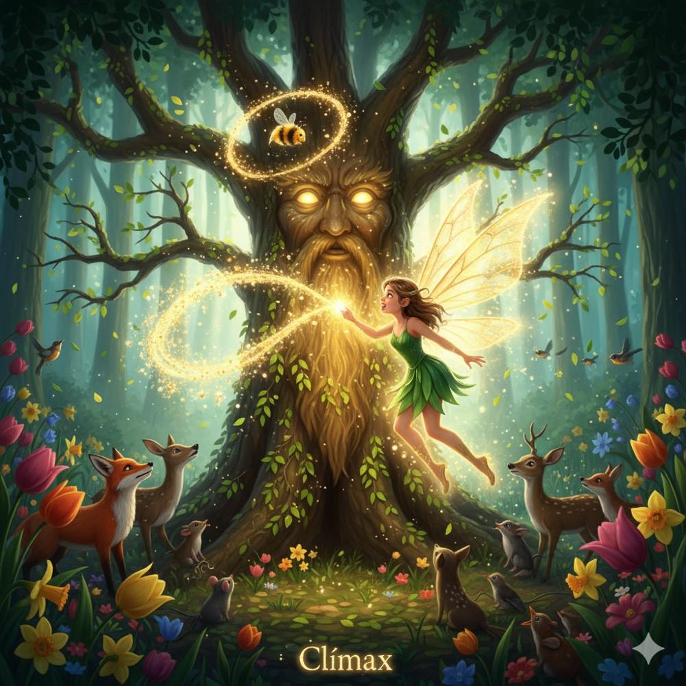 El Gran Sauce Sabio estaba ahora visiblemente afectado, sus ramas cuelgan sin vida y su energía disminuía. Lila y Zumbador se acercaron, sintiendo la tristeza que emanaba del antiguo árbol. "Solo la Canción de la Primavera, cantada desde el corazón de aquellos que creen en su poder, puede reavivarme", susurró el Sauce con una voz que era apenas un suspiro de viento. Lila, sin dudarlo, alzó su varita y comenzó a entonar una melodía dulce y poderosa. Sus alas brillaron con más intensidad mientras los animales del bosque, atraídos por la música, se unían con sus propios cantos y chirridos. Zumbador voló en círculos, esparciendo más polen mágico. La energía fluyó a través de Lila y hacia el Sauce. Lentamente, los ojos del árbol se abrieron, un resplandor dorado emanó de su tronco y sus ramas comenzaron a enderezarse, cubriéndose de brotes frescos y hojas vibrantes. El bosque entero sintió una oleada de energía.