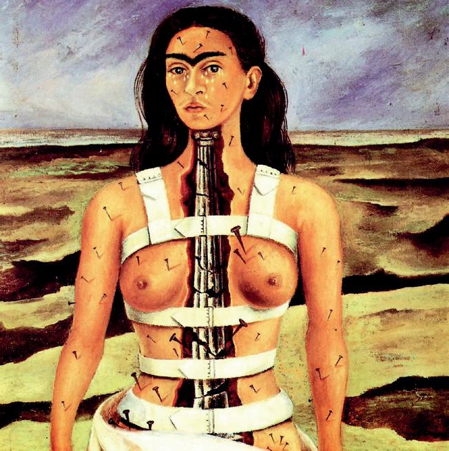 Este autorretrato explica muy claramente lo que sucedía con su cuerpo. Frida llora porque tiene rota su columna jónica (lo femenino) y sólo un doloroso corsé de metal la mantiene moderadamente firme. Tiene clavos por todo su cuerpo, simbolizando el dolor al que quizás su rostro se ha acostumbrado. Frida aguanta con resignación y estoicismo, sacando belleza donde no la puede haber, como sacar agua de ese desierto que tiene detrás.