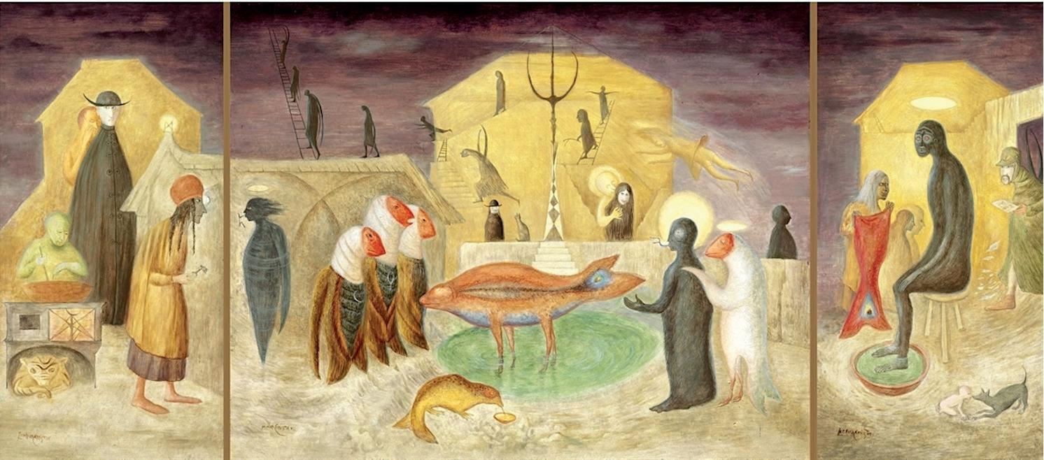 Carrington consiguió un lenguaje visual muy personal, abarrotado de personajes oníricos. Con una técnica exquisita que insiste en el detallismo la autora nos regala un bestiario fascinante y sugestivo.