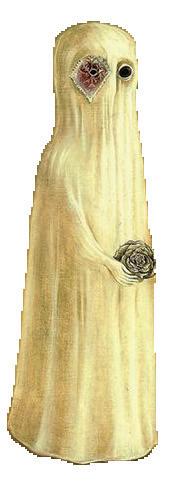 El rostro de la novia aparece cubierto por una espantosa máscara de lechuza, destacando entre el plumaje un ojo humano y una cabeza. En el lado izquierdo, un curioso pájaro sostiene lo que es la punta de una lanza rota, y en el lado opuesto, podemos observar dos extraños seres, una niña con un peinado inquietante y un monstruo diminuto.