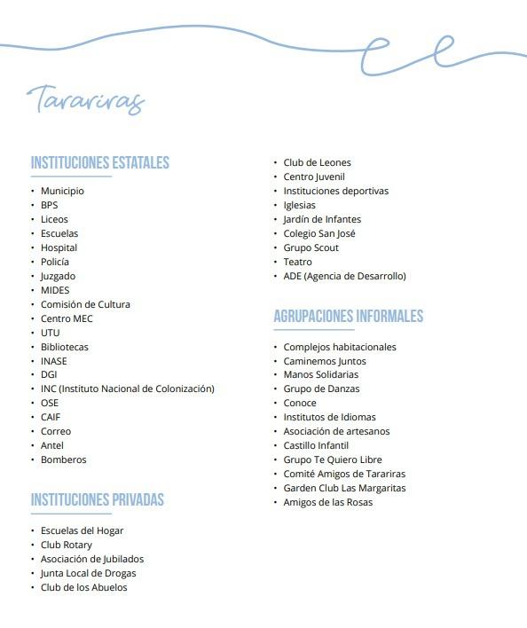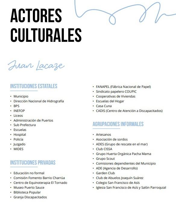 Dentro de la infraestructura considerada por los participantes de los talleres, surgida a partir de la técnica del transecto, se enumeran a continuación los lugares mencionados para Juan Lacaze yTarariras.
