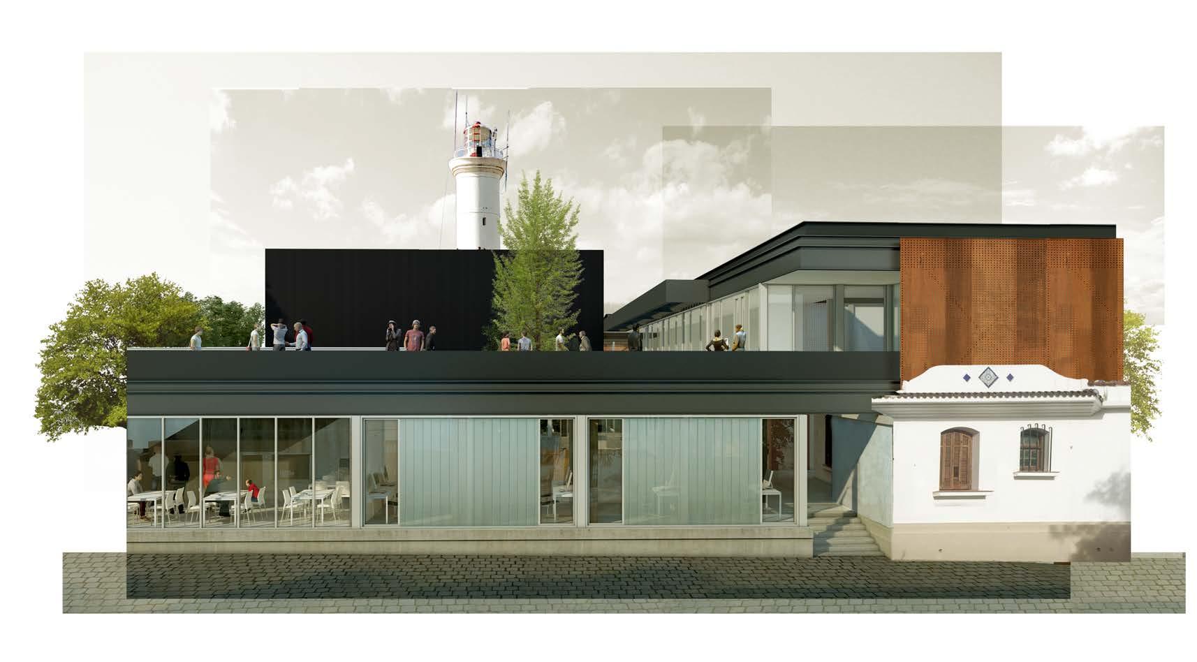 Paramentos Chapa Acero, Chapa acero corten, pasamanos acero inoxidable (barandas) Piel acero corten microperforado / Vidriera Placa cementicia pintada color blanco. Pavimentos Entablonado madera natural tratada (empalomado) Malla en planchuela de hierro tipo Orsogril.