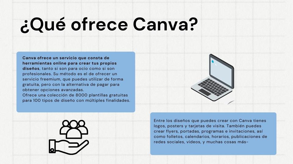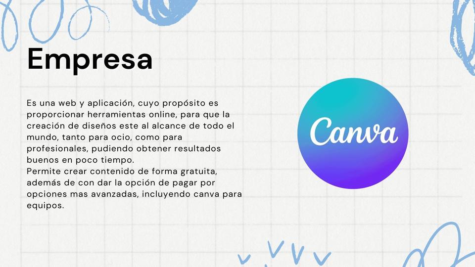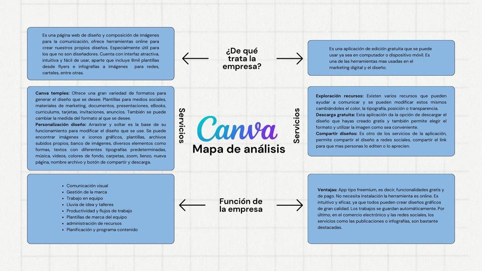 V a l o r e n t r e g a d o a c l i e n t e s : s u v a l o r a p u e s t a a u n a p l a t a f o r m a f á c i l d e u s a r c o n h e r r a m i e n t a s q u e p e r m t e n c r e a r d i s e ñ o s c o n a p a r i e n c i a p r o f e s i o n a l P r o b l e m a s q u e r e s u e l v e : F a l t a d e c o n o c i m i e n t o s o b r e d i s e ñ o : l a i n t e r f a z i n t u i t i v a p e r m i t e c r e a r c o n h e r r a m i e n t a s y a e x i s t e n t e s c o m o p a n t i l l a s T i e m p o S u s p l a n t i l l a s y h e r r a m i e n t a s e x i s t e n t e s a g i z a n e l p r o c e s o T r a b a j o c o l a b o r a t i v o : p e r m i t e t r a b a r s i m u l t á n e a m e n t e a v a r i o s u s u a r i o s . N e c e s i d a d e s q u e s a t i s f a c e : M e d i a n t e l a c a n t i d a d d e h e r r a m i e n t a s a c c e s i b l e s q u e o f r e c e C a n v a s a t i s f a c e l a n e c e s i d a d d e l u s u a r i o d e c r e a r c o n t e n i d o d e a l t a c a l i d a d s i n s e r e x p e r t o e n d i s e ñ o P r o d u c t o s q u e o f r e c e : P a t a f o r m a p a r a c r e a r c o n t e n i d o g r á f i c o P a n t i l l a s q u e s e p u e d e n p e r s o n a l i z a r y e d i t a r A c c e s o a s t o c k d e i l u s t r a c i o n e s , i c o n o s e i m á g e n e s d e u s o g r a t u i t o T r a b a j o c o l a b o r a t i v o