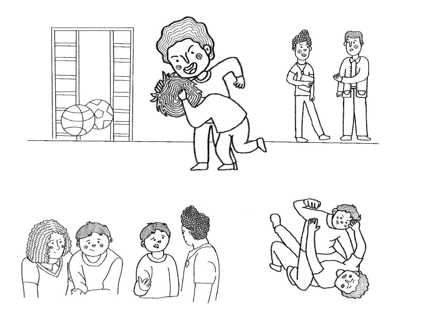 Responder a la situación agresivamente con golpes para demostrar que eres fuerte es algo innecesario y poco viable. Recomendamos acudir a un adulto y probar nuestra pieza del mural estrategico