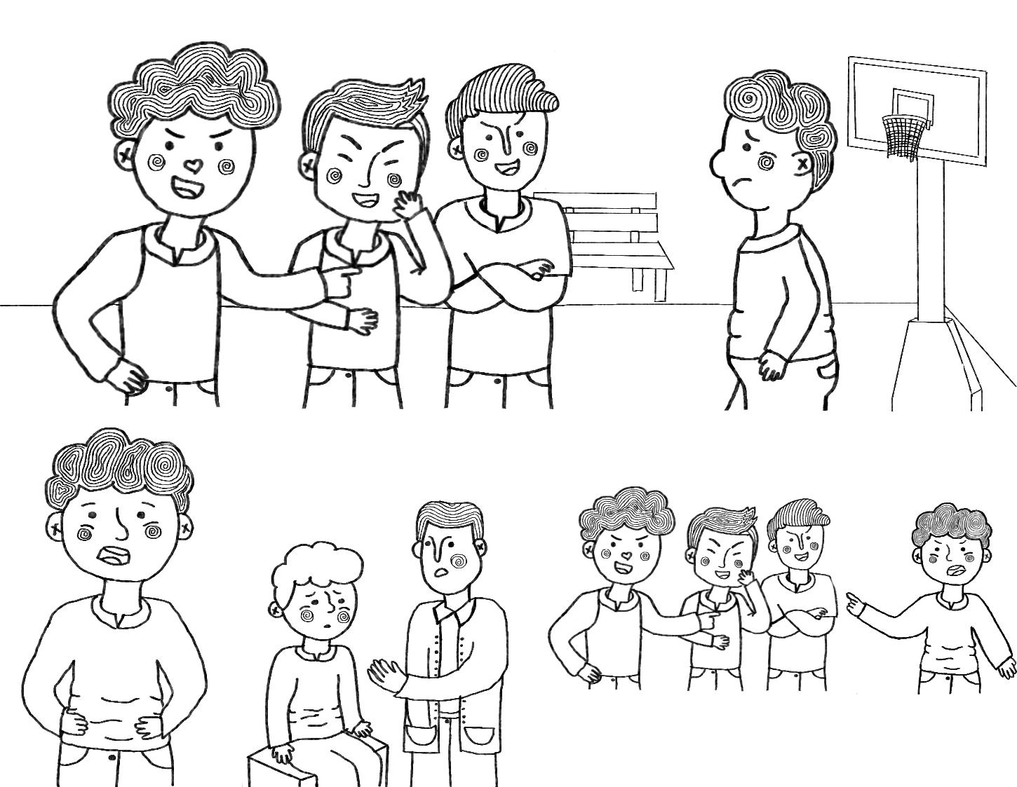 En el descanso un grupo de compañeros se burlan de mi por mi peso. Cada vez que paso cerca de ellos, escucho comentarios como “ballena” y “Gordito”. Me siento humillado y empiezo a evitar ciertas áreas del colegio para no encontrarlos.