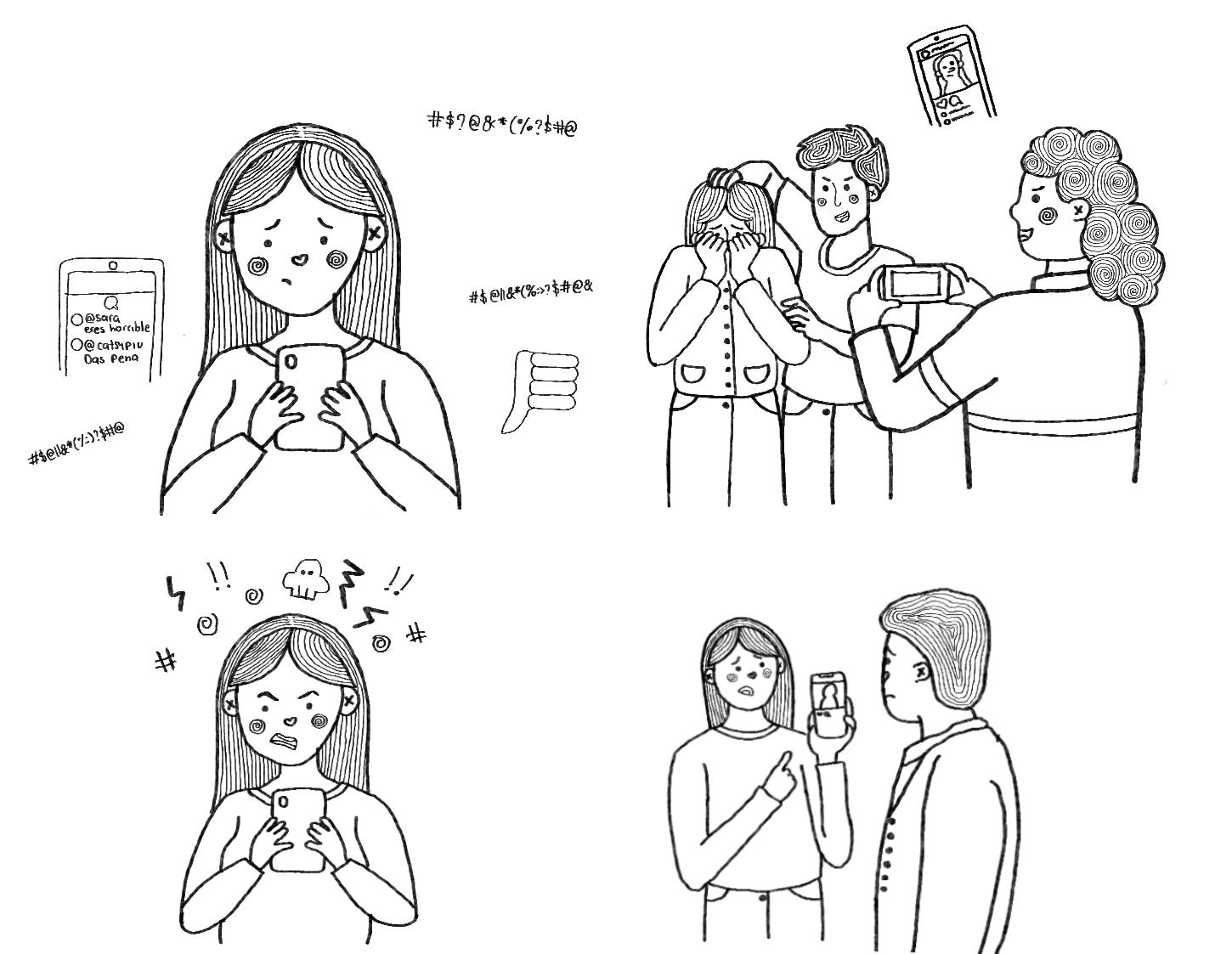 En el grupo de whatsapp de la clase, algunos compañeros han comenzado a enviarme mensajes crueles y publicar fotos editadas mias en instagram sin mi consentimiento, ahora no puedo usar redes sociales sin sentirme hummillada.