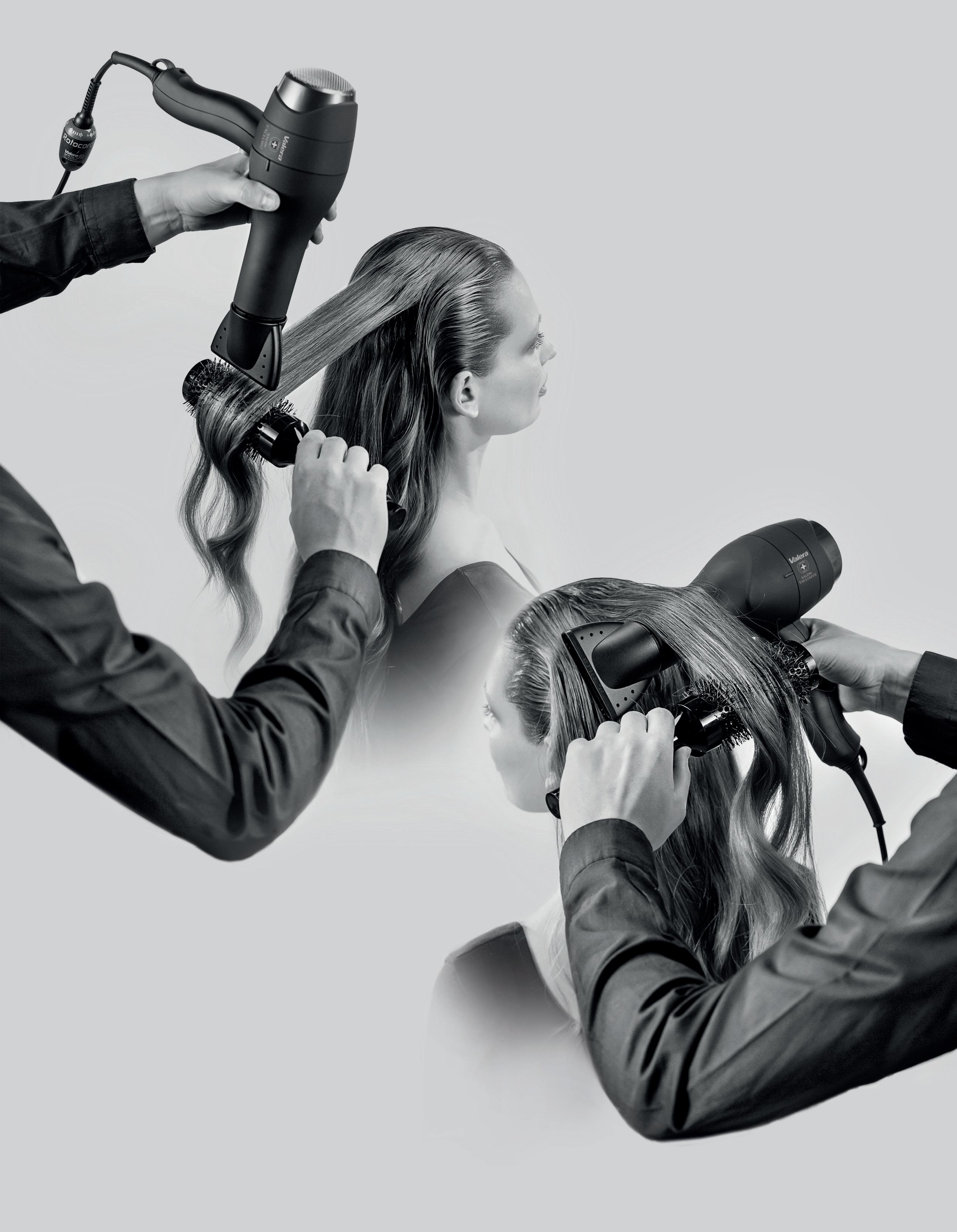 The hairdryer has an ergonomic handle but for special techniques it can be held just as comfortably on the cool barrel or on the motor body. The long barrel supports the hair when used in combination with a round brush, allowing for easier blow-drying. Dynamic styling for creative looks.