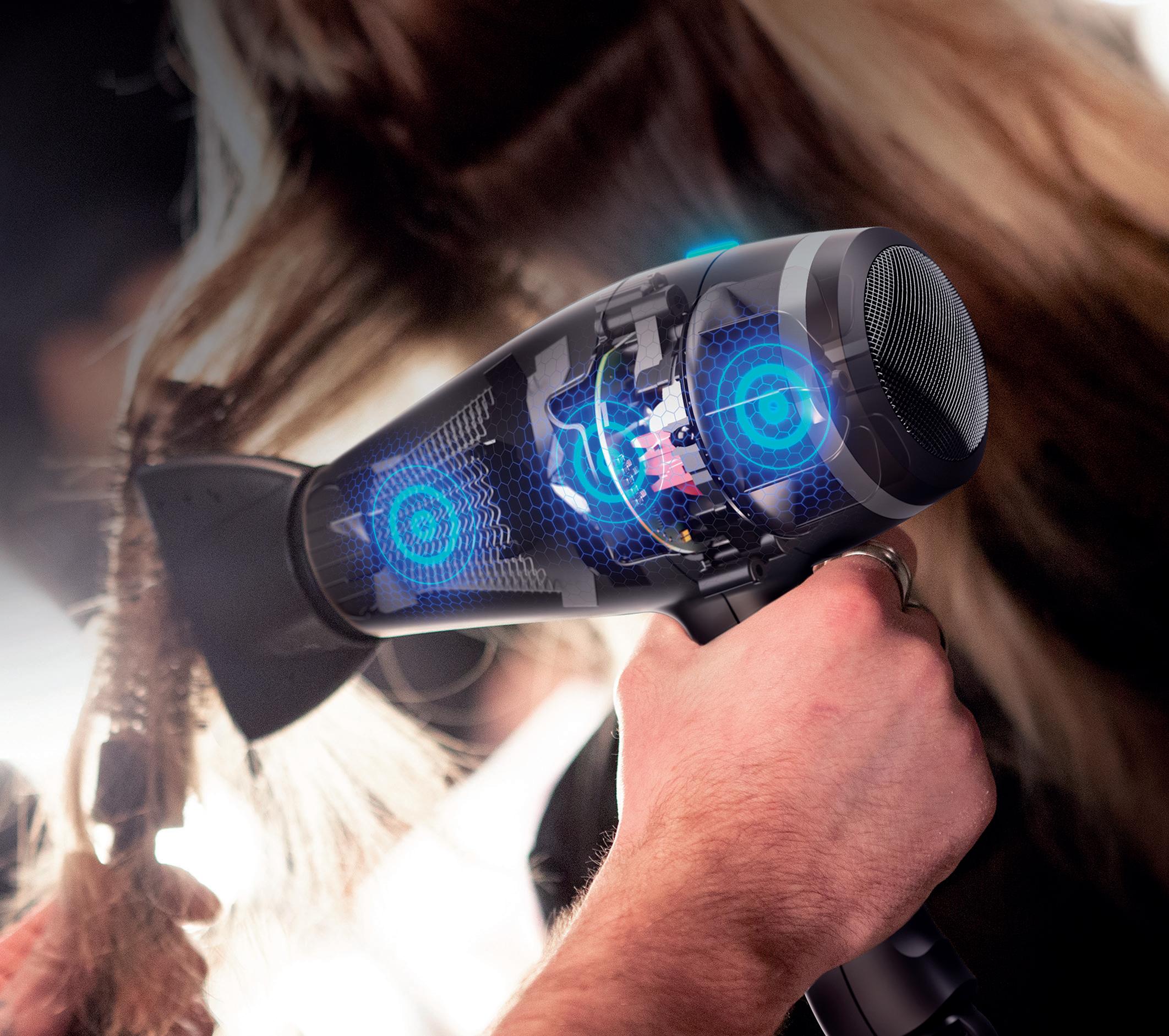 Le dimensioni più contenute del classico motore AC (Alternated Current) sono state sviluppate per massimizzare il comfort, pur mantenendo invariate le prestazioni e la potenza di asciugatura dell’asciugacapelli. Esso produce un flusso d’aria e una pressione elevata con un peso moderato.