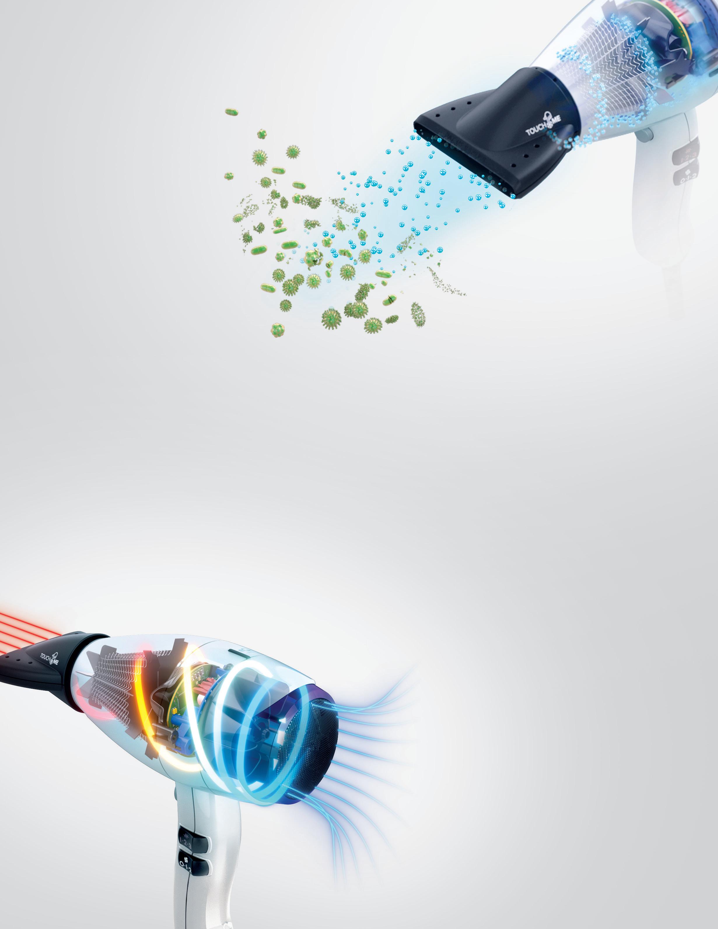 Un’invenzione esclusiva nel mercato degli asciugacapelli: la bocchetta brevettata TOUCH ME che, grazie al suo innovativo sistema a doppia parete autoraffreddante, non si surriscalda. Durante l’asciugatura la bocchetta può essere toccata e ruotata in qualsiasi posizione. Questo significa più creatività per gli hairstylist.