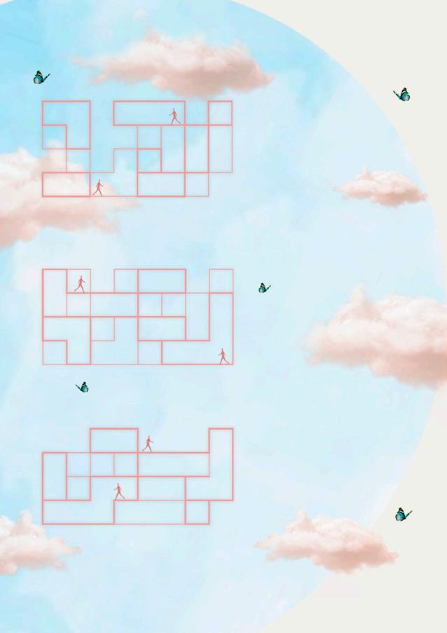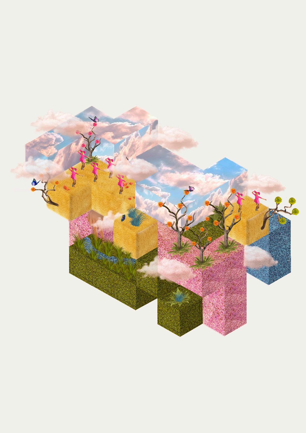 La composición se logra una vez extraídos los elementos y re cursos gráficos, tales como la naturaleza raramente alterada cro máticamente, o la jerarquía obtenida por cada personaje. Es por ello que se creó un módulo en el que se pudo representar aquella narrativa en cada una de sus caras isométricas. Una vez obtenida la identidad visual del video, se realizaron cortes para poder obser var el interior de la estructura y observar como una persona puede transitar dentro de él, sin perder la esencia característica de cada escena.