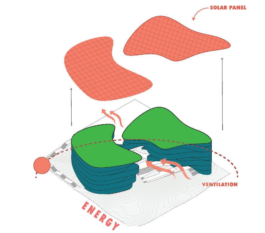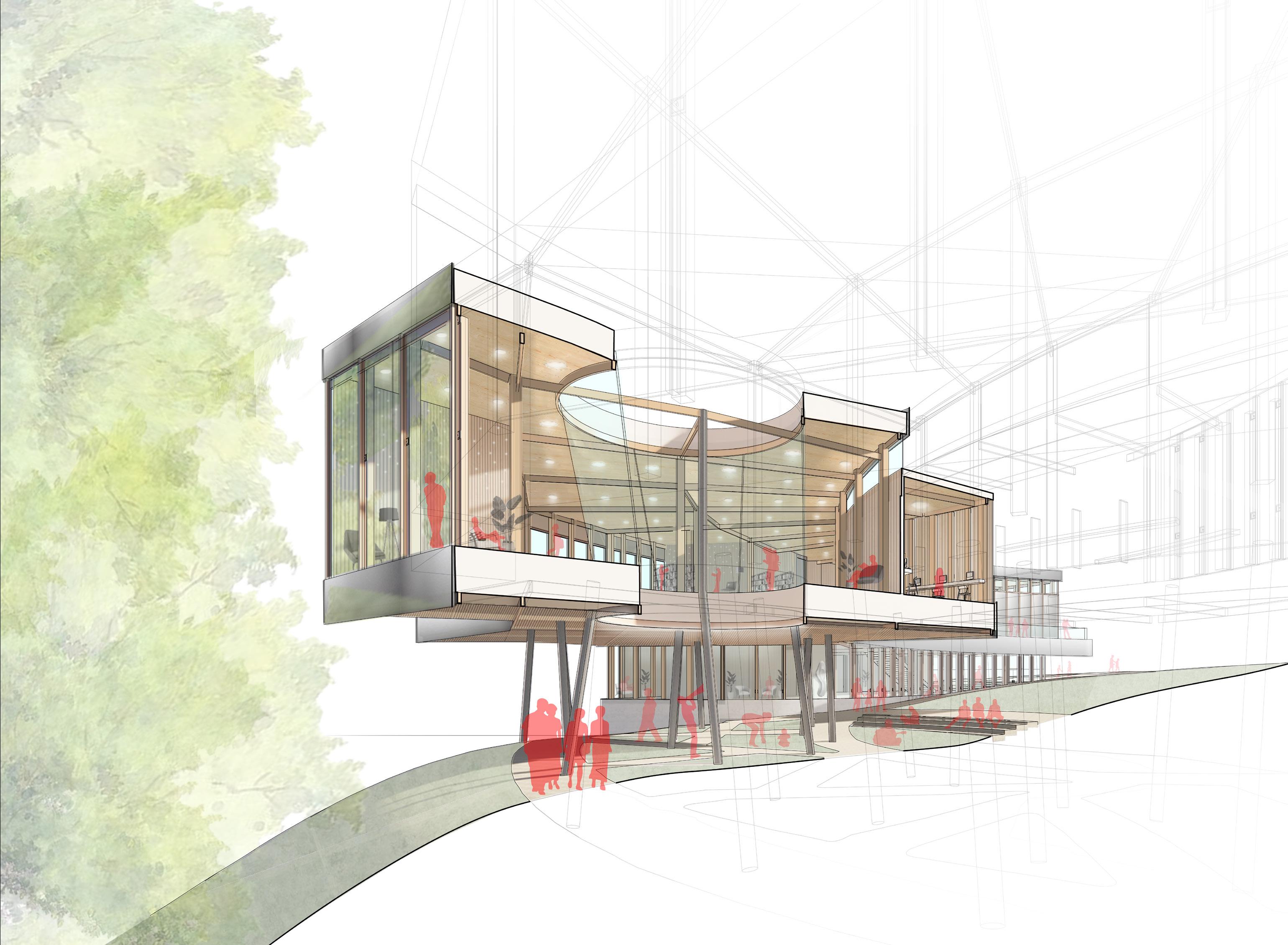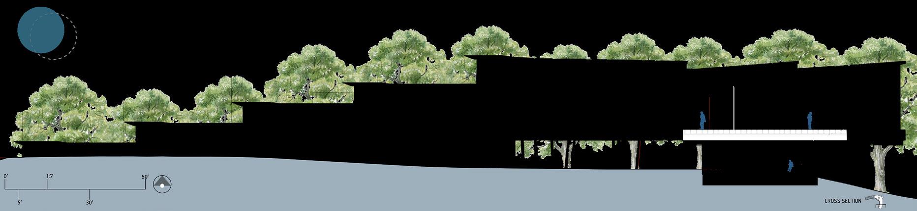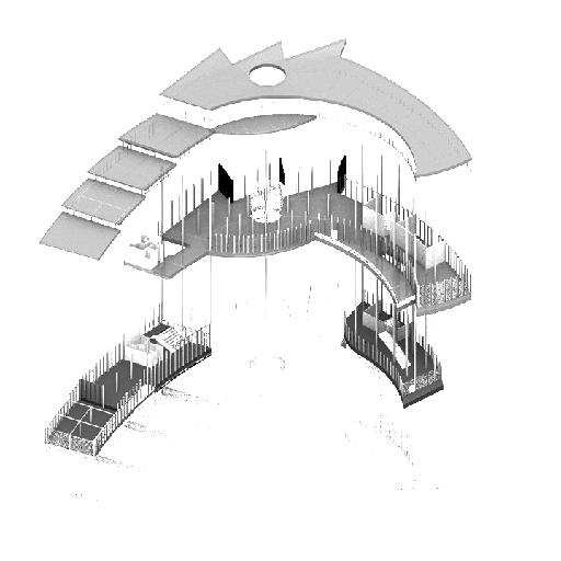 TIONS WITH THE SURROUNDING NATURE AIM TO BRING PEOPLE INTO THE LIBRARY AND EXTEND THE ACTIVITIES WITHIN IT. THE USE OF NATURAL LIGHT AND COHESIVE VERTICAL PATTERN ON THE FACADE ADD TO THE OVERALL AESTHETIC OF THE BUILDING WHILE ALSO PROVIDING A FUNCTIONAL PURPOSE. THE OCULUS SPACE AND EXTERIOR AREA UNDERNEATH IT ALSO SERVE TO BREAK DOWN THE SCALE OF THE BUILDING. OVERALL, THE DESIGN INCORPORATES A BALANCE OF FORM AND FUNCTION TO CREATE A SPACE THAT MEETS THE NEEDS OF THE COMMUNITY