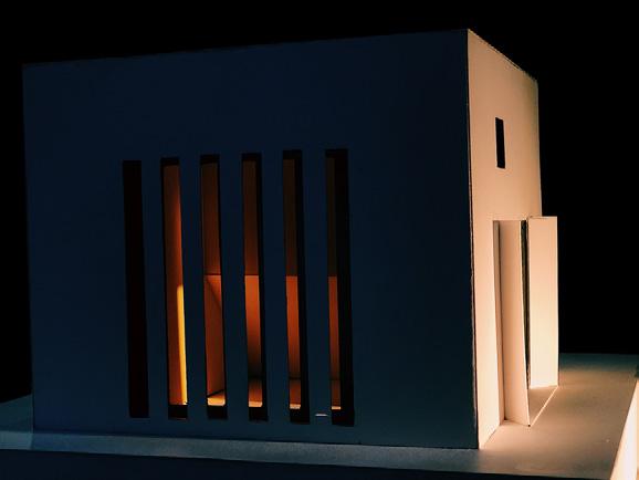 THE LIGHTBOX PROJECT IS A LIGHT STUDY THAT NOT ONLY FOCUSES ON SHADOW AND LIGHT PROJECTION BUT COLOR AND CHANGE. EVERY ASPECT OF THIS PROJECT WAS HANDMADE, AND EACH COLOR IS PAINTED WITH OIL PASTELS OVER THE WHITE MUSEUM BOARD. IT REPRESENTS AN INTERIOR SPACE, WHERE ONE OF ITS SIDES ITS A LAYERED WHITE OVER BLACK WALLS THAT HAVE SIX SKINNY VERTICAL OPENINGS FROM WHERE THE LIGHT WOULD ENTER THE SPACE, AND ANGLED FINS. THE BOX ALSO PROJECTS A SENSE OF HIERARCHY, THE ENTRANCE DIRECTS THE VIEW DIRECTLY TO THE FOCAL POINT WITH LAYERED BLACK PANELS. THE INTERIOR OF THE SPACE HAS AN ASYMMETRICAL-SHAPED CEILING THAT BREAKS DOWN THE SCALE AND ALLOWS THE LIGHT TO REFLECT UP AND DOWN INTO THE ROOM. INSIDE THE BOX WAS PAINTED A LIGHT PINK BUT AS THE LIGHT ENTERS THE SPACE THROUGH THE VERTICAL APERTURES, PLACES WHERE THE LIGHT TOUCHES CREATE A CONTRAST BETWEEN LIGHT AND COLOR, BECOMING AN ALTERNATION OF DARK-LIGHT PATTERN ALTERNATION THAT HAPPENS NATURALLY. PHYSICAL MODEL