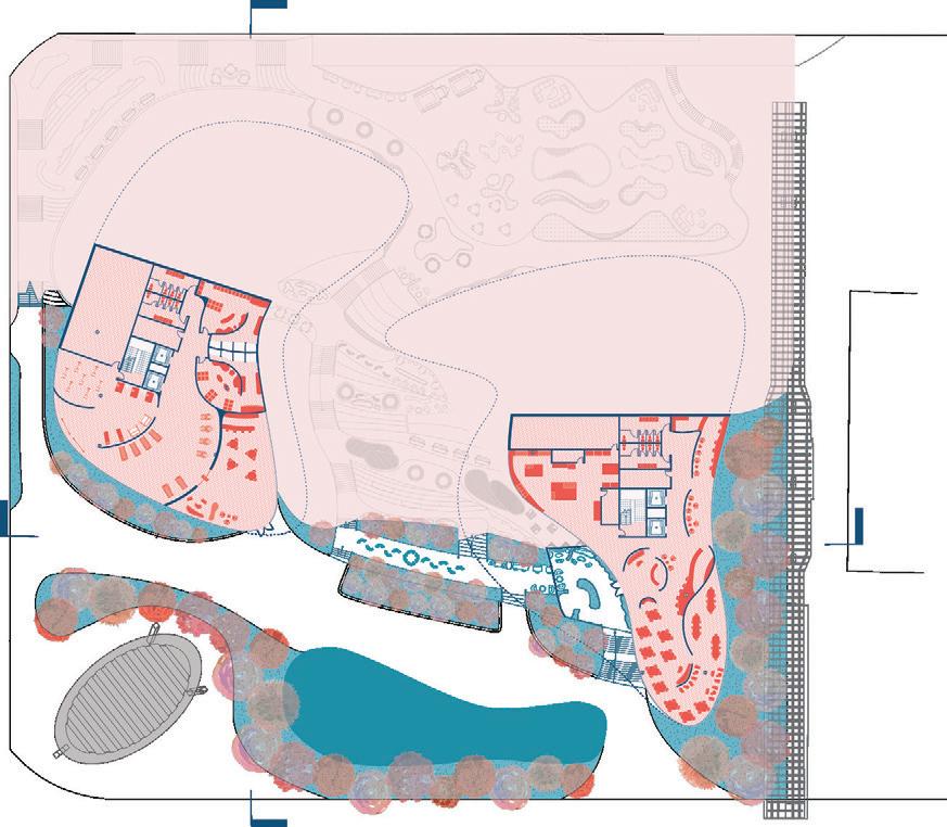 FACILITATING MOVEMENT AND OFFERING CLEAR NAVIGATION, WHILE ADJACENT PAVILIONS ACCOMMODATE VARIOUS FUNCTIONAL ACTIVITIES IN A COZY, DOMESTIC SETTING. ADDING DEPTH TO THE BUILDING’S NARRATIVE, A