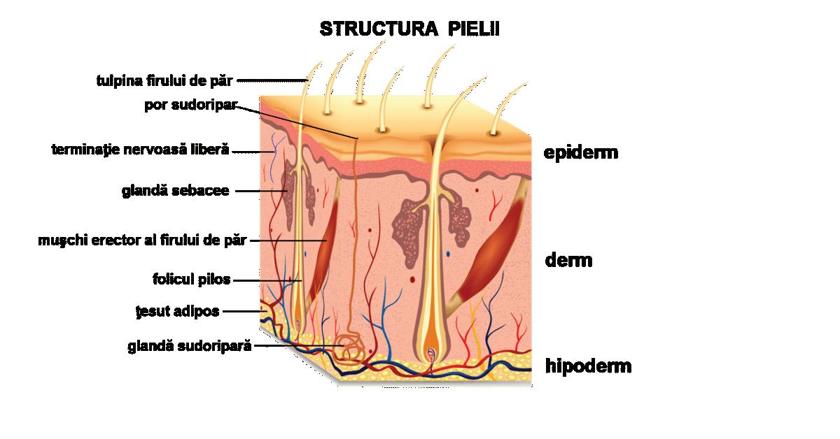Cele 3 straturi sunt: EPIDERMA, DERMA şi HIPODERMA este alcătuit din cinci straturi de celule suprapuse, denumite din profunzime spre suprafață: bazal, spinos, granulos lucidum și cornos. Toate straturile provin din stratul bazal, ale carui celule, pe masură ce se multiplică sunt împinse spre suprafață schimbându-şi necontenit forma şi structura.