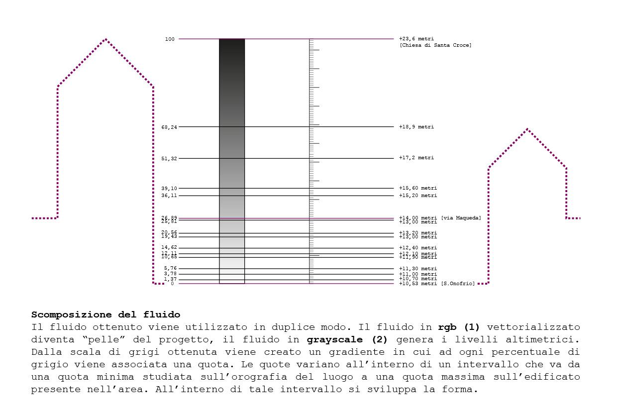 quelle del nuovo flusso di identità che si distribuiscono sulla depressione del Papireto, rispettando la direzione monte/mare, che nei parametri impostati sul software maya equivalgono a gravity = -9,8 e seguendo la velocità di andatura di un pedone, circa 2 km/h. p.zza fonderia p.zza garraffo slargo venezia p.zzetta caldomai p.zza s.onofrio p.zza montedi pietà pas. alla guilla p.zza beati paoli p.zza appalto p.zza s.eligio p.zza s.andrea p.zza garraffello ricostruzione altimetrica 1.Chiesa di Santa Croce [XIV secolo] 3 4 6 2 2.Oratorio di San Giovanni dei Gerosolimitani [XVII secolo] 3.Cimitero della parrocchia di Santa Croce 4.Palazzo Buttino [XVII secolo] 5.Palazzo dei Duchi di Castelluzzo 6.Edificio residenziale [esistente al XVI secolo] Studio dell’isolato 1 ricostruzione storica degli edifici che vi avevano sede 2 costruzione di un piano altimetrico ideale di riferimento L’analisi storica ha rivelato la presenza di manufatti ecclesiastici [due chiese e un piccolo cimitero annesso] ed edifici per civile abitazione, che hanno subito nel corso del tempo un processo di riedificazione e sostituzione fino ai primi anni del ‘900. Si registra la presenza di un’arena all’aperto [cinema Maqueda] in stile liberty. Furono in parte distrutti o resi inagibili durante i bombardamenti che la città subì durante la seconda guerra mondiale. I resti vennero totalmente rimossi dalla Curia [proprietaria dell’intero isolato] agli inizi degli anni ’80 per questioni di pubblica sicurezza. Il piano di riferimento è stato costruito unendo i punti quotati della cartografia ufficiale [scala 1:500] e ricavando delle sezioni che ne descrivono l’andamento altimetrico. Questa ricostruzione ideale servirà, in fase progettuale, da interfaccia tra il sistema di sezioni tratte dal fluido e le altimetrie reali del luogo.