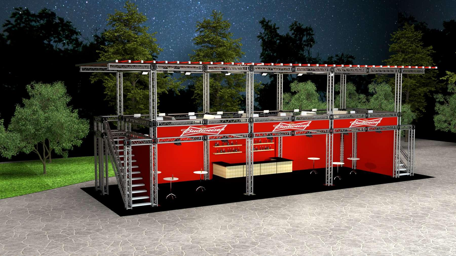Propuesta en 3D de espacio VIP de dos pisos construido en truss para evento de música al aire libre.