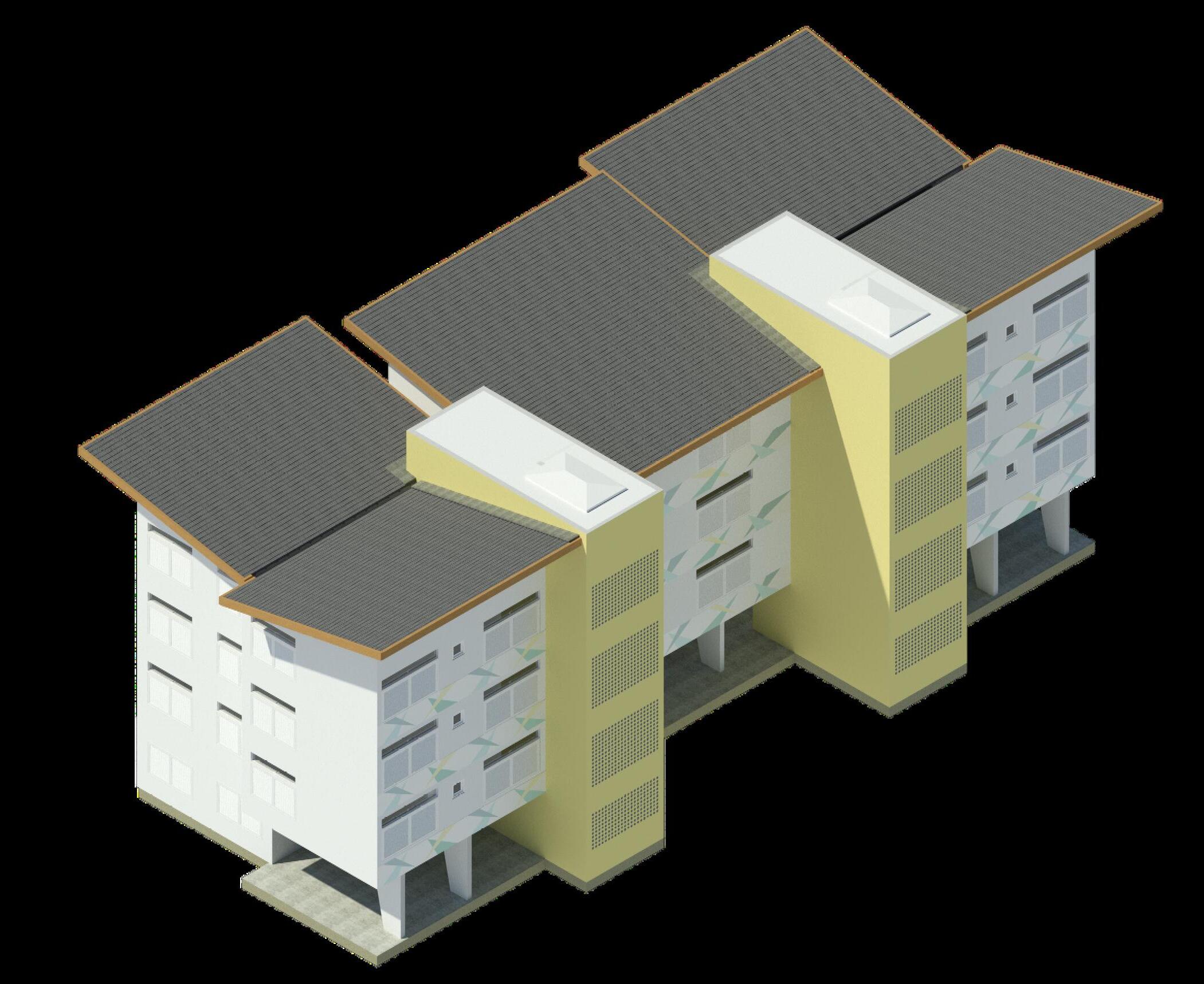 A volumetria inicial foi pensada com uma tipologia linear ou em lâmina. Posteriormente, foram adicionados volumes em algumas partes e subtraídos de outras. Esta escolha se deu pelo fato de priorizarmos a ventilação dos apartamentos, voltadas para a rua em todas as fachadas, como forma de proporcionar segurança para os pedestres.
