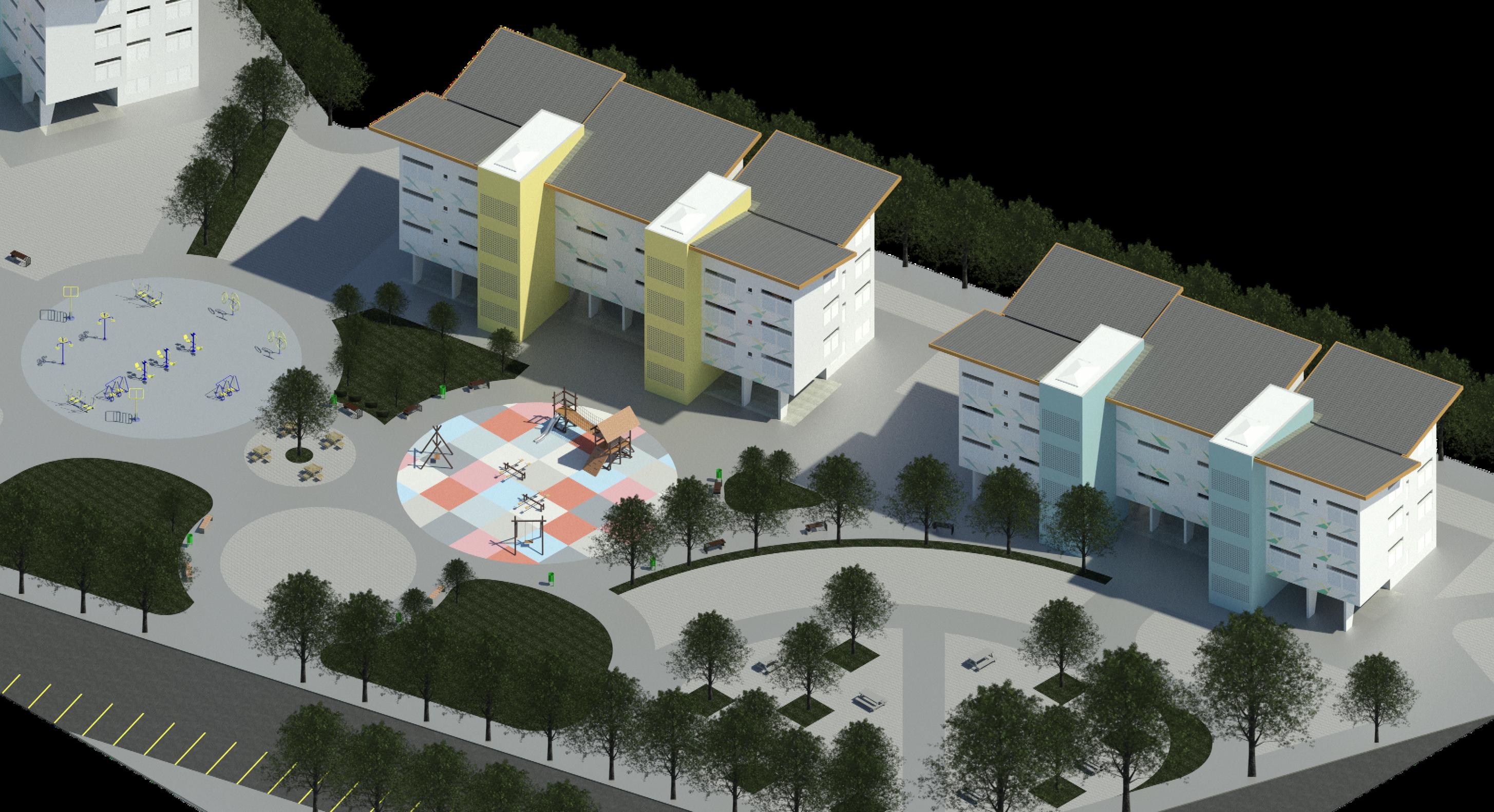 São 14 edifícios distribuídos no terreno, os quais possuem suas faces principais para os sentidos norte-sul com exceção de dois blocos que devem estar fixados nos sentidos nordeste-sudoeste.