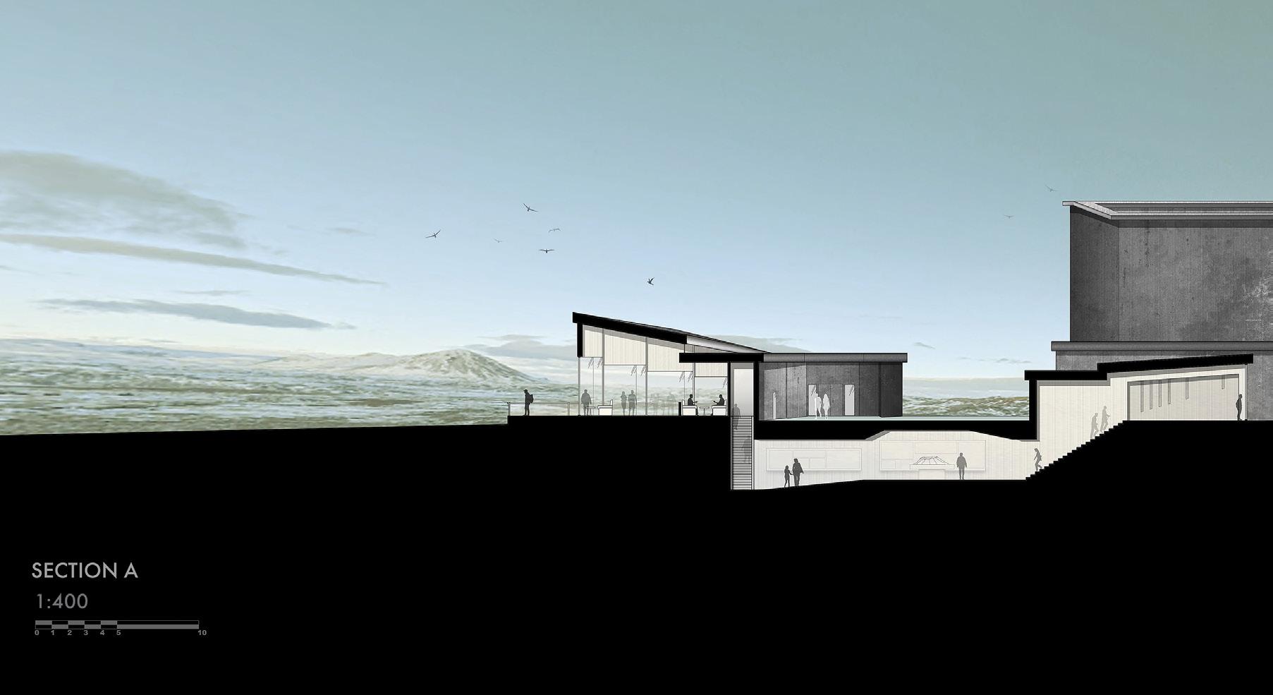 The base level observatory inverts the traditional associations with lights- usually in the sky. It blocks one’s view from the heavens, instead presenting only a body of water, mandating visitors to experience light at that level only through the reflections thereof.