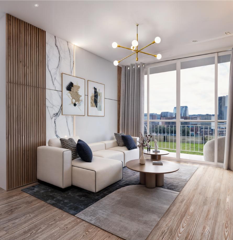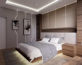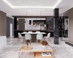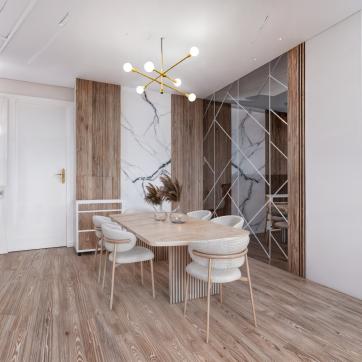 During my internship, I created apartment designs for several clients in a variety of styles. I want to share my best renderings of a couple of designs. First, there's the Las Magnolias project, where I helped propose designs for the kitchen, living room, dining room, and bedrooms. I also handled all the renderings for the client's deliverable. The design uses light, woody tones and features some LED lighting details to maintain the modern style requested by the client.