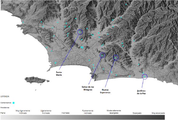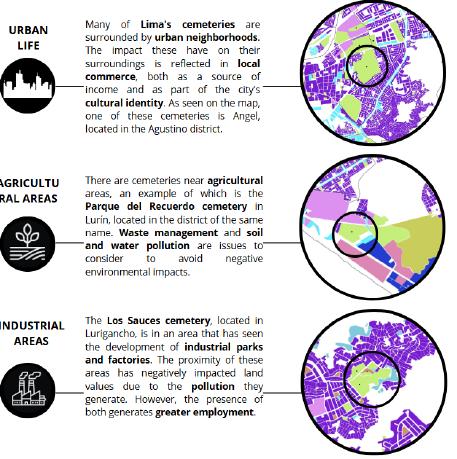 Physical connections are influenced by variables such as geographic location, public transportation, and the road network. In Lima, cemeteries are mostly located on the outskirts, which helps relieve congestion in denser urban areas and provides more space for expansion.