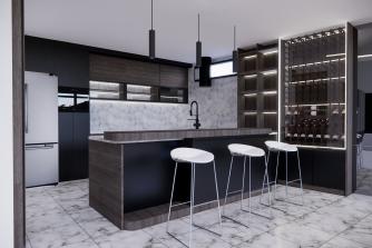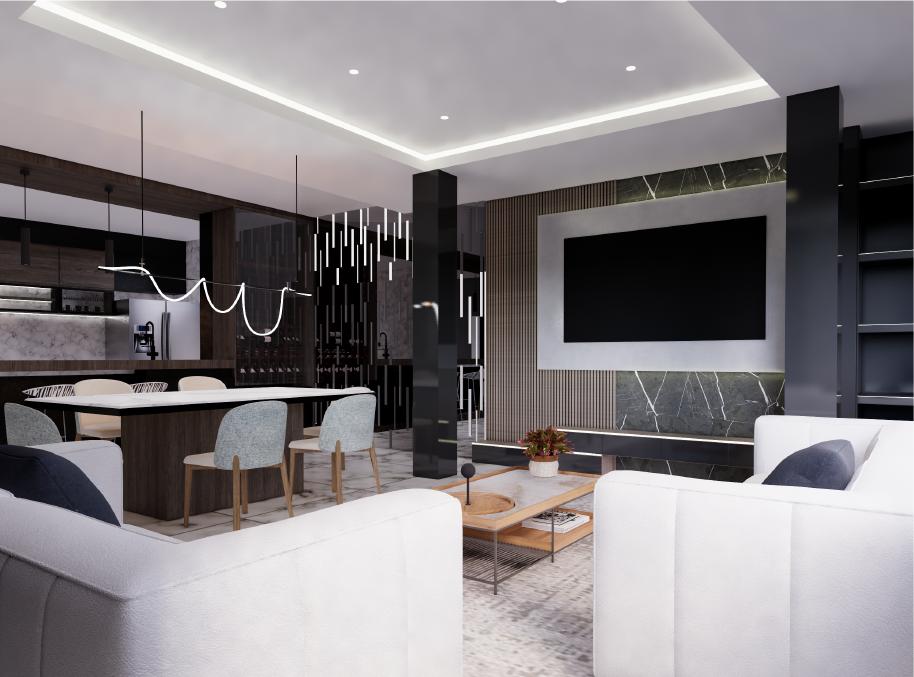 The second is the Carabayllo project, which was designed from the ground up. I participated in proposing space layout options, installations, a 3D survey, and rendering. The client's request was for a modern design with dark tones and plenty of LED lighting. They also wanted several luxurious finishes and all walls veneered or decorated. The design was approved, and the building is currently under construction.