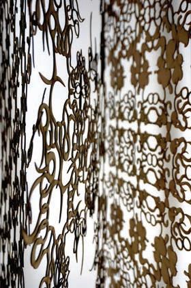The formation of the principal grid enhances the geometric and abstract composition made with dowels. An overall grid perception is represented in the whole fixture creating the allusion of infinity, continuity, and expanded dimension. Several barcodes in the lower surface of the composition transmit the color “break” or pronounced di erence of grid perception.