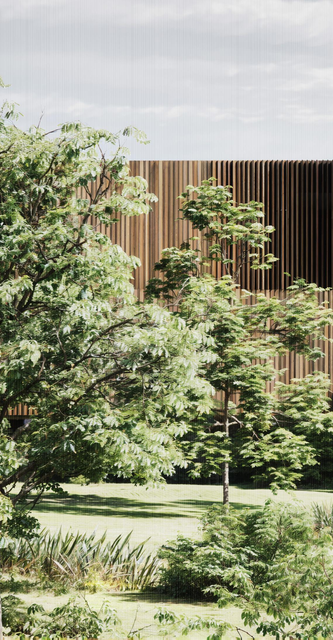 The linear arrangement is interrupted with perpendicular columns and beams spanning the distance of the wild courtyard acting as tectonic elements connecting the two buildings together representing the anthropocene timeline. The sunken buildings have mass walls retaining the earth and it contrasts with the light overhead elements of the beams reaching across the space inbetween.