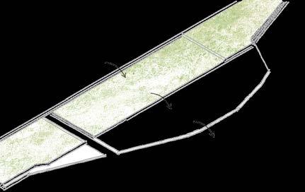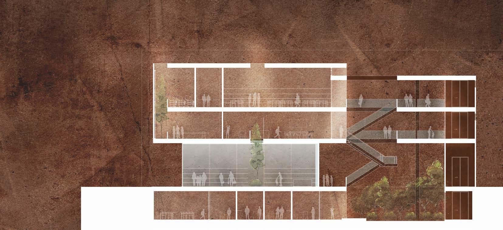 The linear arrangement is interrupted with perpendicular columns and beams spanning the distance of the wild courtyard acting as tectonic elements connecting the two buildings together representing the anthropocene timeline. The sunken buildings have mass walls retaining the earth and it contrasts with the light overhead elements of the beams reaching across the space inbetween.