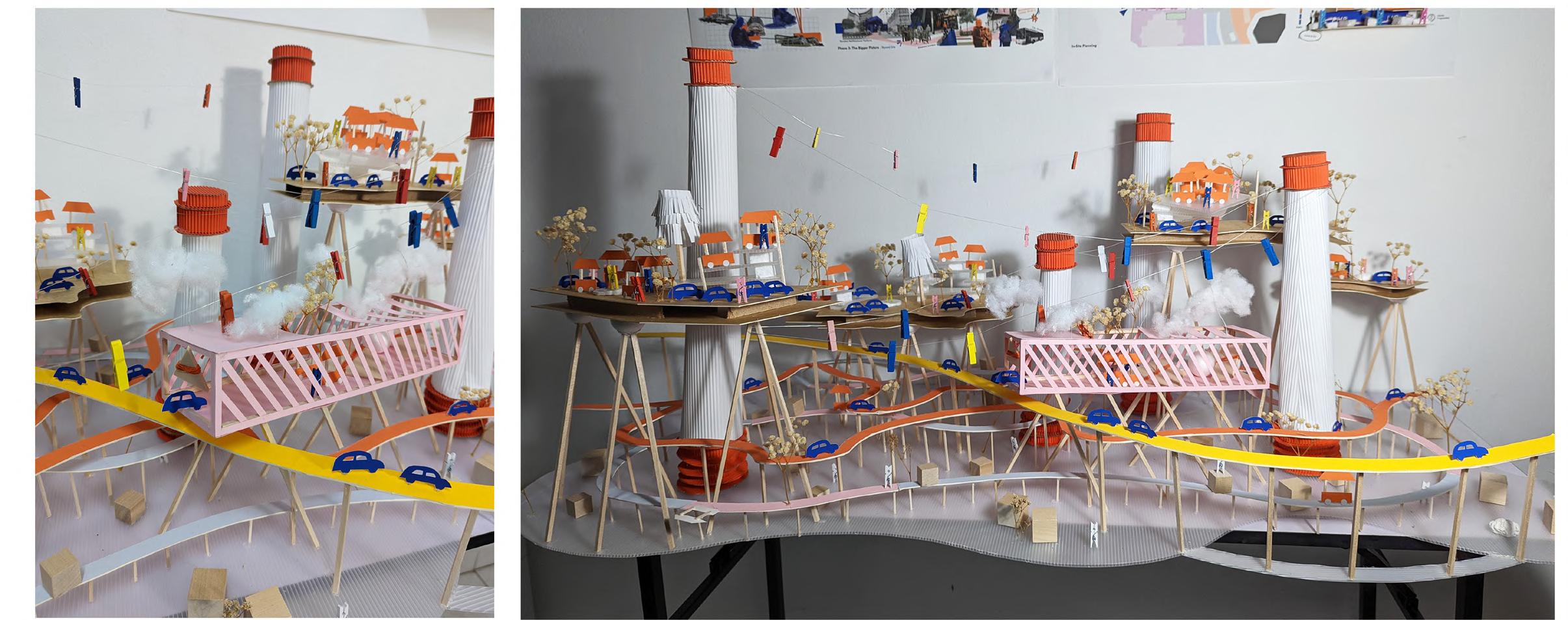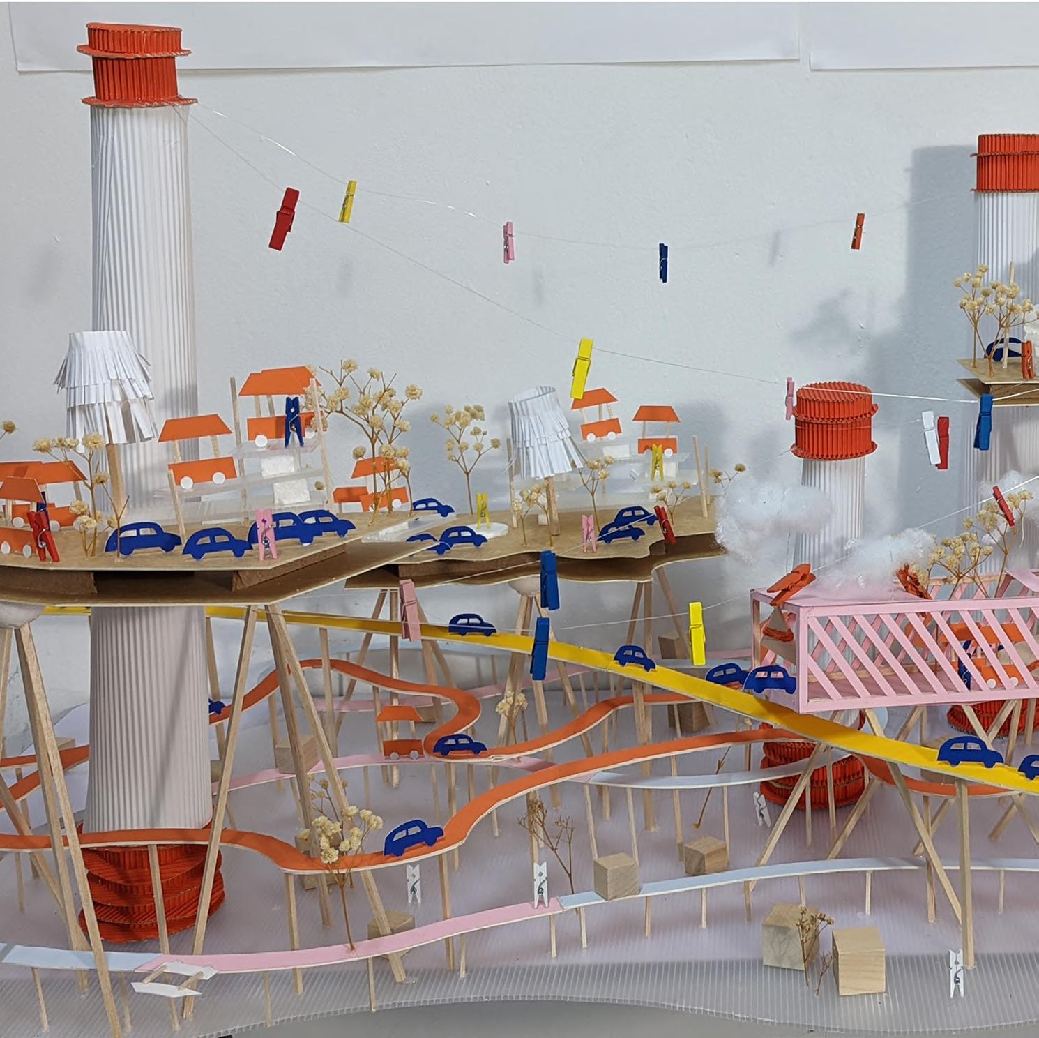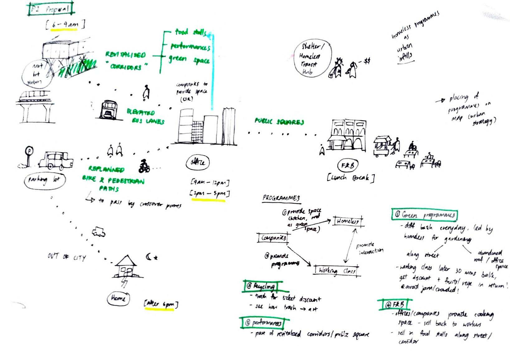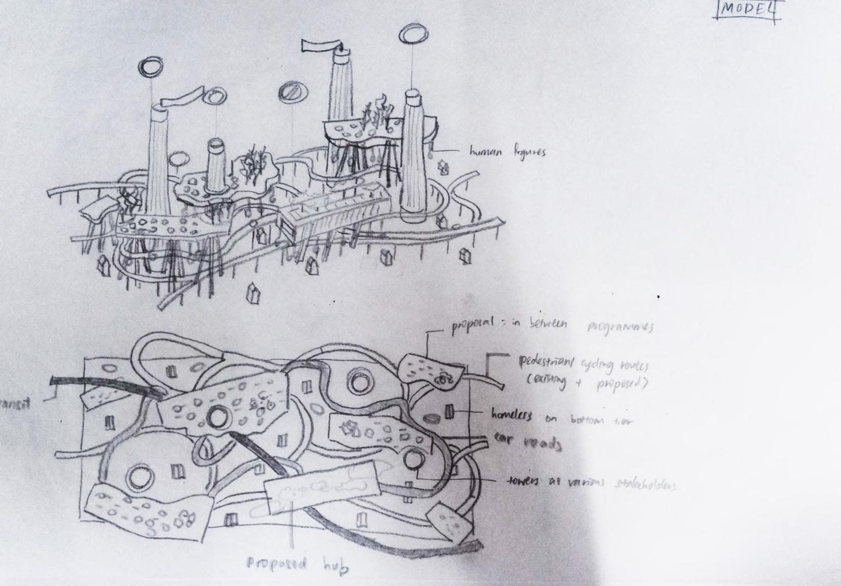 The wooden blocks and white clips represent the homeless people and problems lying beneath and how they are trying to regain a place back in society. The roads and cars shows the movement in and out as well as within the city; so much movement yet lack of interaction and warmth between different social tiers. The platforms and elements on top such as playscape, stalls and performing platform represents all the proposal. The different connection lines show how different stakeholders aid in connecting the pieces - slowly easing interaction between the people while adding fun and meaningful parts all over the city.