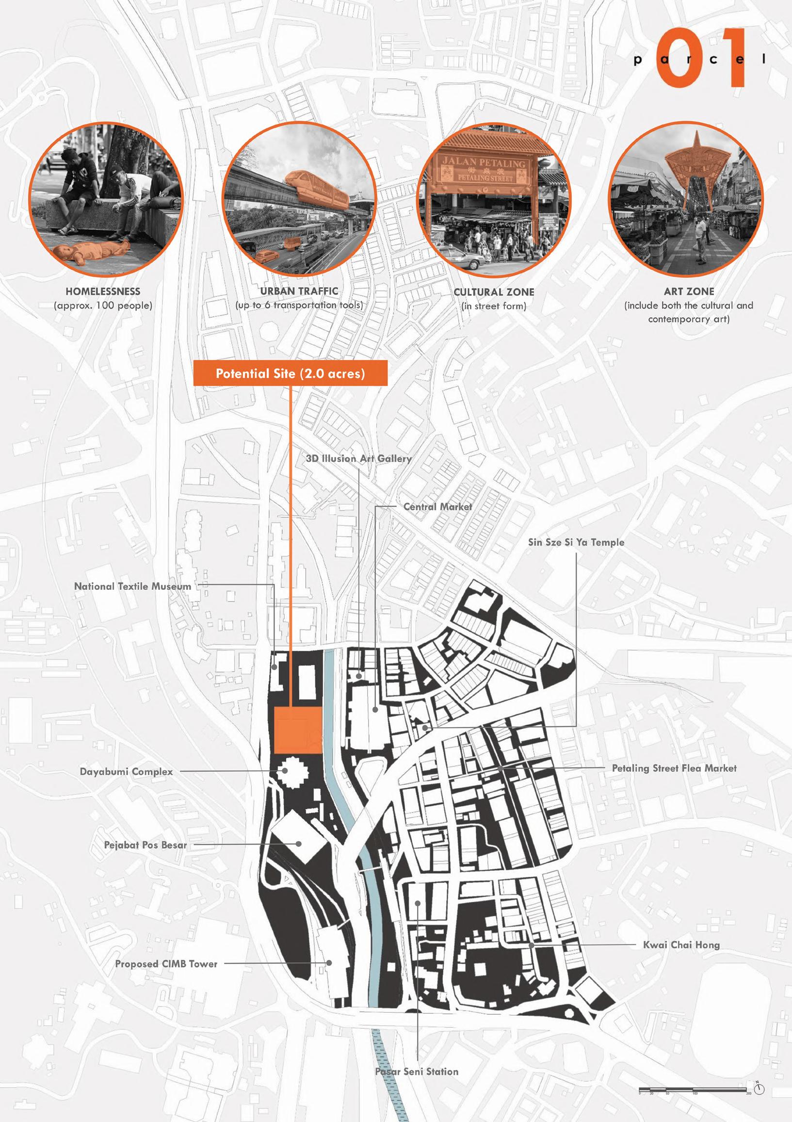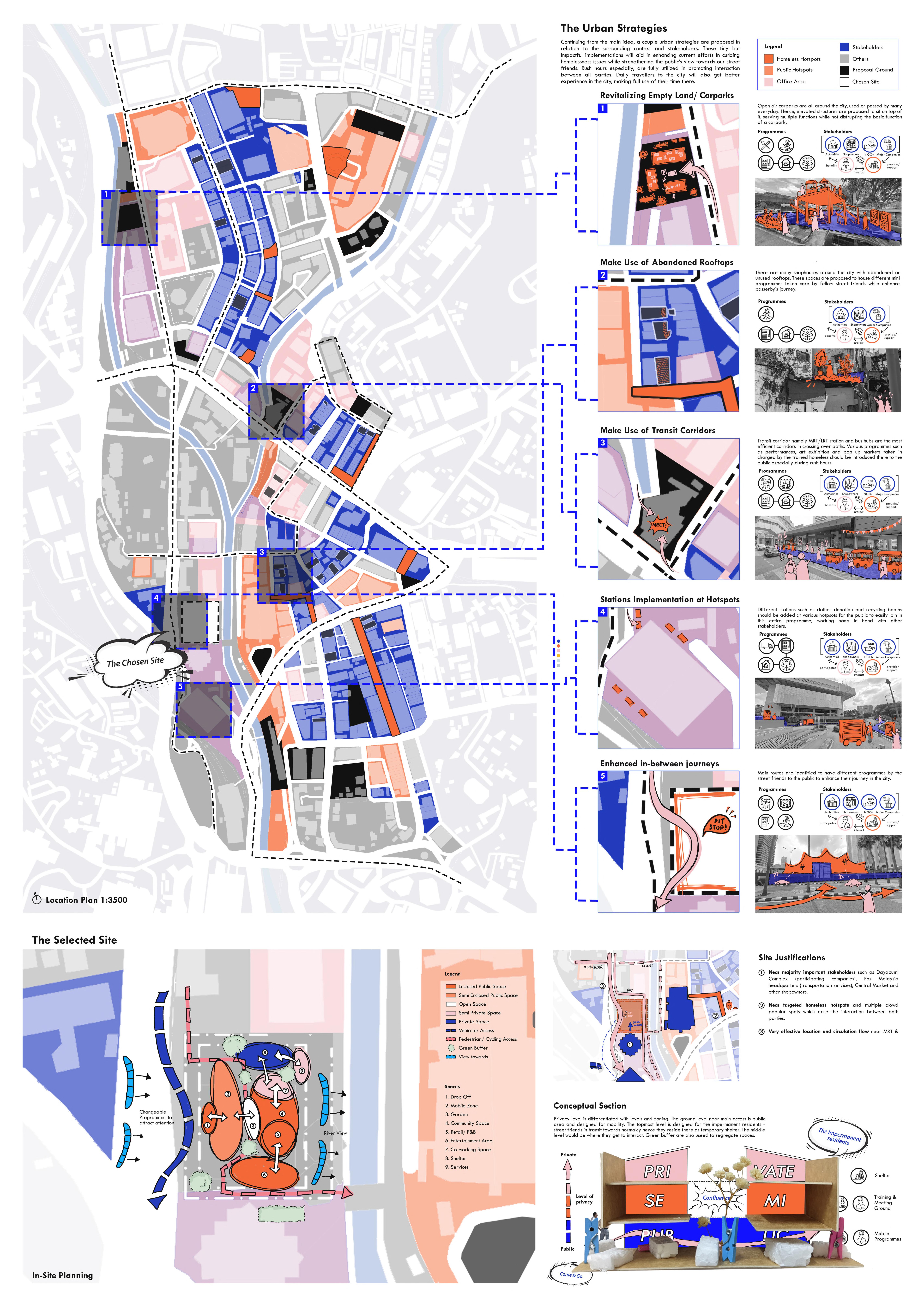 Everyday, many people are seen travelling to KL city centre especially office workers via public transport or cars which is evident during site visits. However, after rush hours and especially at night, most of them leave and those left behind are the homeless with no place to go. Day by day, the situation worsens but no efficient actions seem to take place. Why is it that the city is full of movement and short moments of crossovers yet lack of interaction between different parties? There is a lack of empathy and connection between one another. Obviously, immediate changes can’t be expected so I believe short probable actions should be taken slowly to ease interaction between the public especially working class and fellow street friends. KL is often known as a transient city because most peo ple come and go but don’t stay for long. Hence, the best time and way to do so is during transit hours and in between routes whereby they are out of their working place yet still within the city. The idea also stems from the play of word ‘transit’ because both target groups - homeless and working class relates to it. The homeless are searching for a transitional period whereby they are given a second chance back to normalcy; the working class needs a transit space be tween work and home - be it a resting & recharging space, eating space of even entertainment area in between. The proposal creates the perfect pit stop and crossover point for both parties where the homeless are first recruited and trained in various areas so they are ready to join society again. The working class on the other hand will stop by this transit space to recharge and these 2 parties will get to meet and interact during those moments. Various stakeholders such as authorities, NGOs, major companies and shopowners are also involved in this proposal where they provide support financially or participate in the training programme. The programmes will also be expanded throughout KL as an urban infill so it’s not limited within site but goes beyond it. All in all, its a project that involves all parties in strengthening the bond between different social tiers as well as filling up the in-between moments in the city for better experience for all.