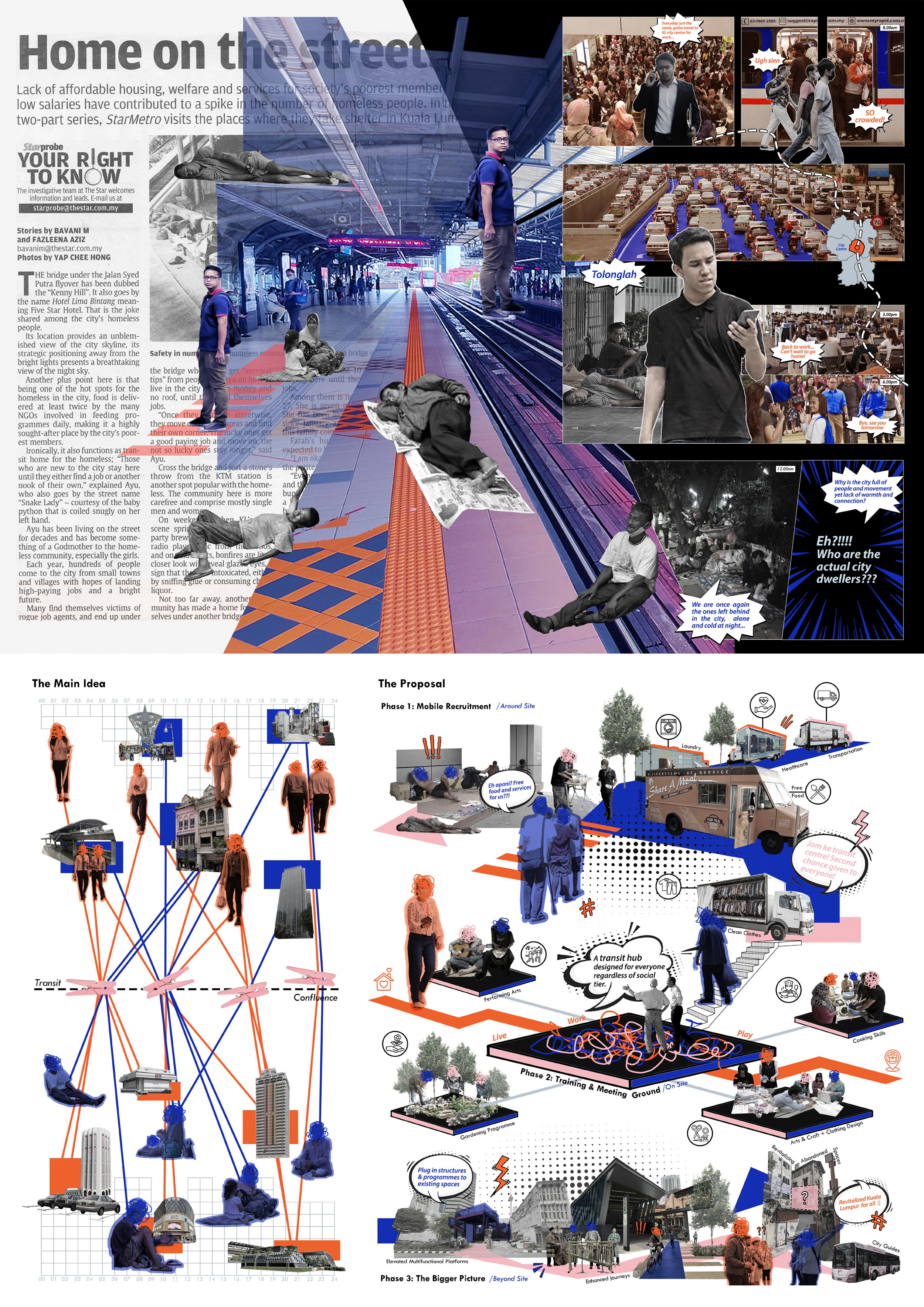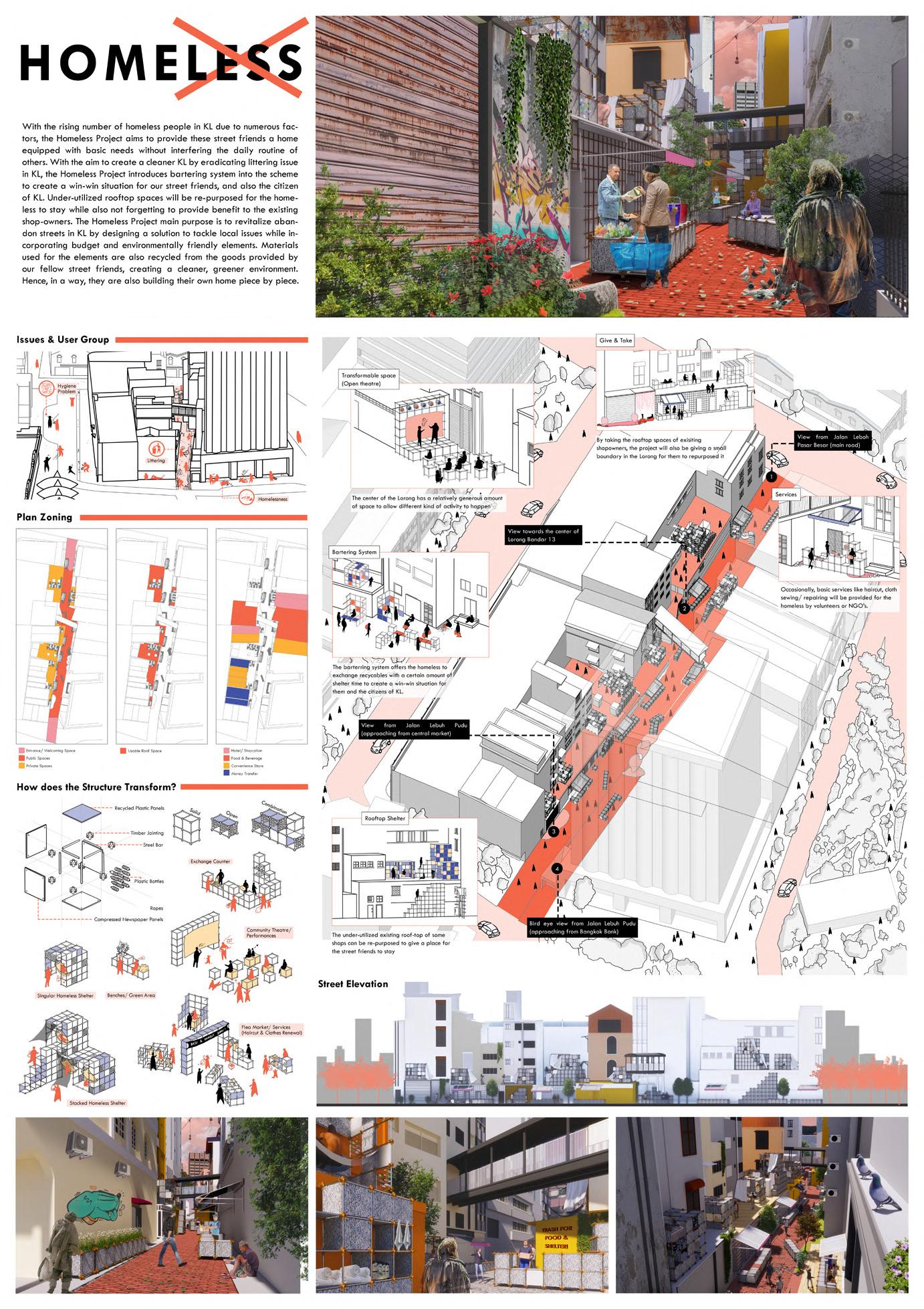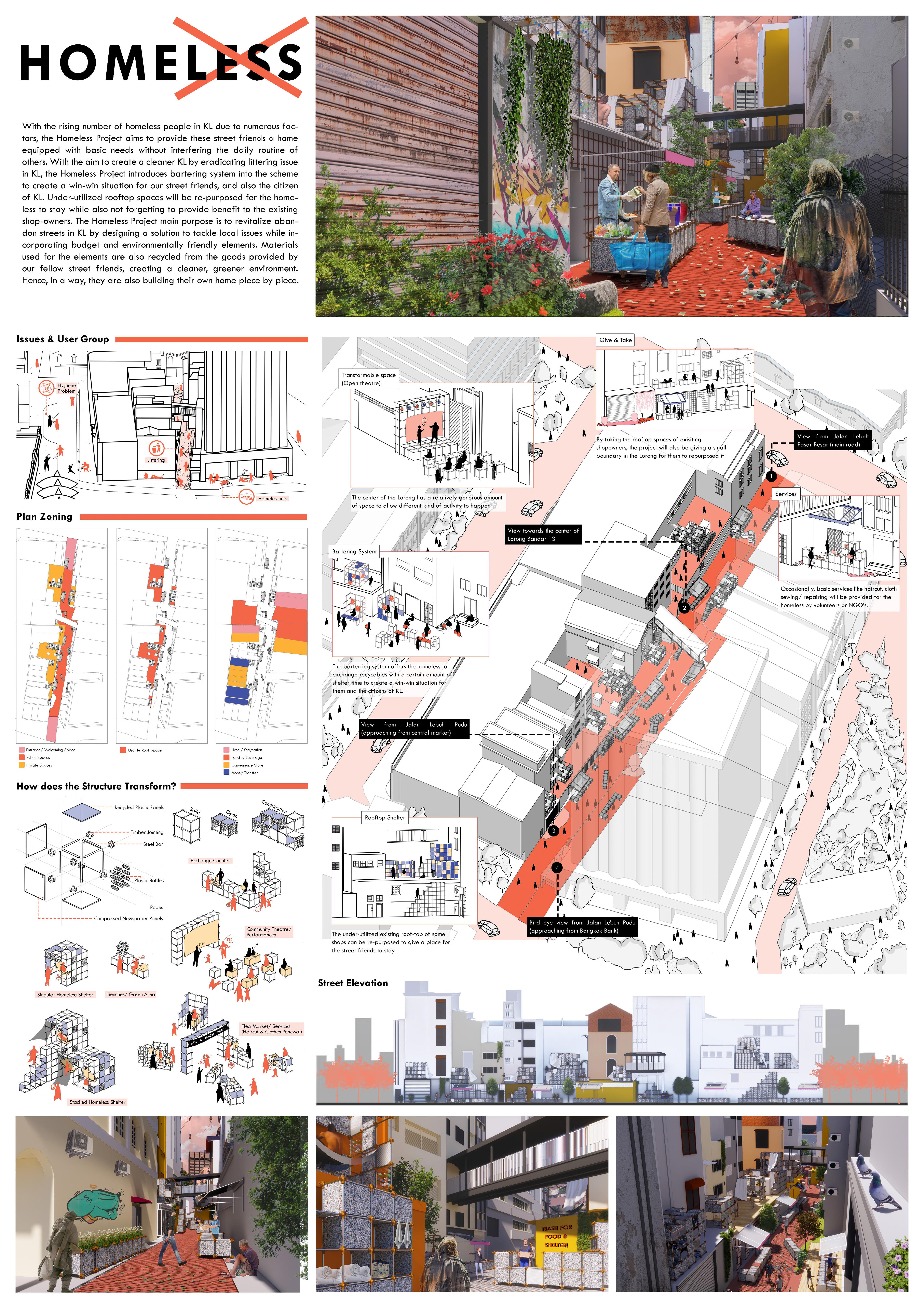 With the rising number of homeless people in KL due to numerous factors, the Homeless Project aims to provide these street friends a home equipped with basic needs without interfering the daily routine of others. With the aim to create a cleaner KL by eradicating littering issue in KL, the Homeless Project introduces bartering sys tem into the scheme to create a win-win situation for our street friends, and also the citizen of KL. Under-utilized rooftop spaces will be re-purposed for the homeless to stay while also not forgetting to provide benefit to the existing shop-owners. The Homeless Project main purpose is to revitalize abandon streets in KL by designing a solu tion to tackle local issues while incorporating budget and environmentally friendly elements. Materials used for the elements are also recycled from the goods provided by our fellow street friends, creating a cleaner, greener environment. Hence, in a way, they are also building their own home piece by piece.