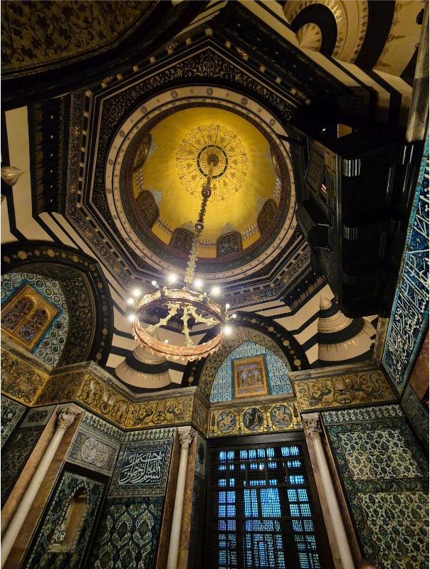 Angela, our excellent guide, talked us through the evolution of Leighton House. She explained that while the initial house was relatively modest, consisting of a dining room, drawing room, breakfast room and staircase on the ground floor, there were just two rooms upstairs: Leighton’s great painting studio, and his surprisingly modest bedroom.