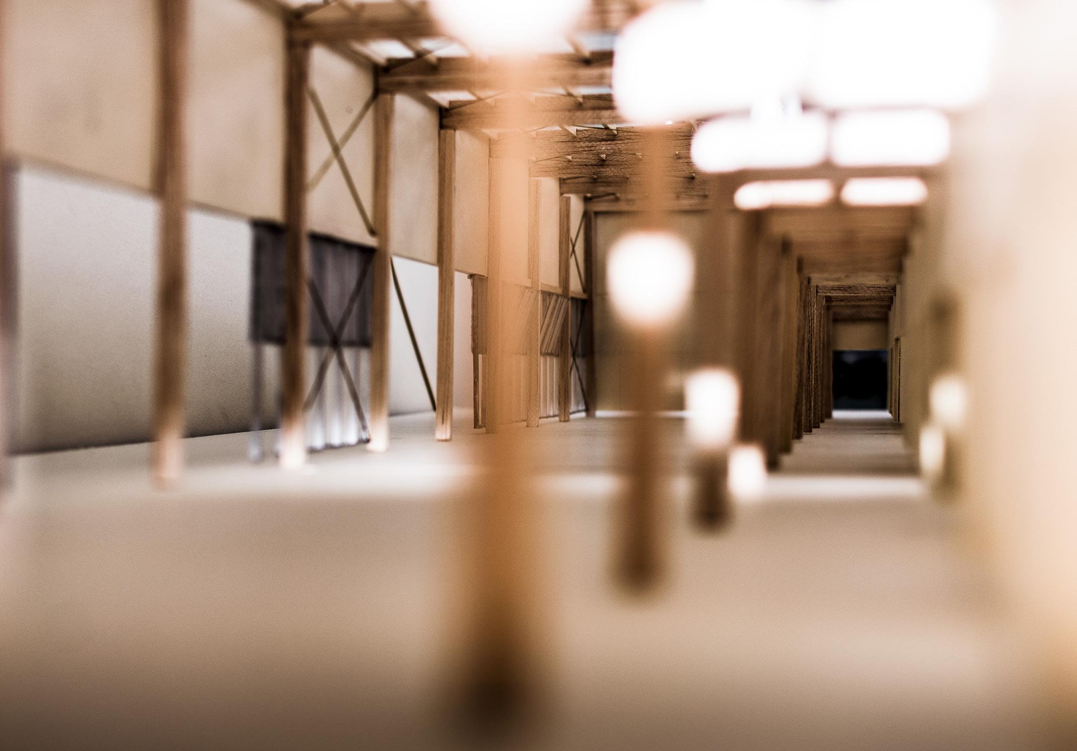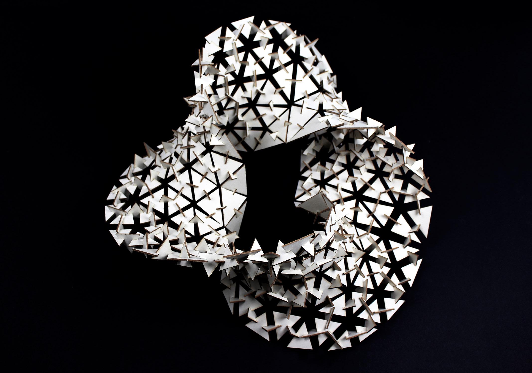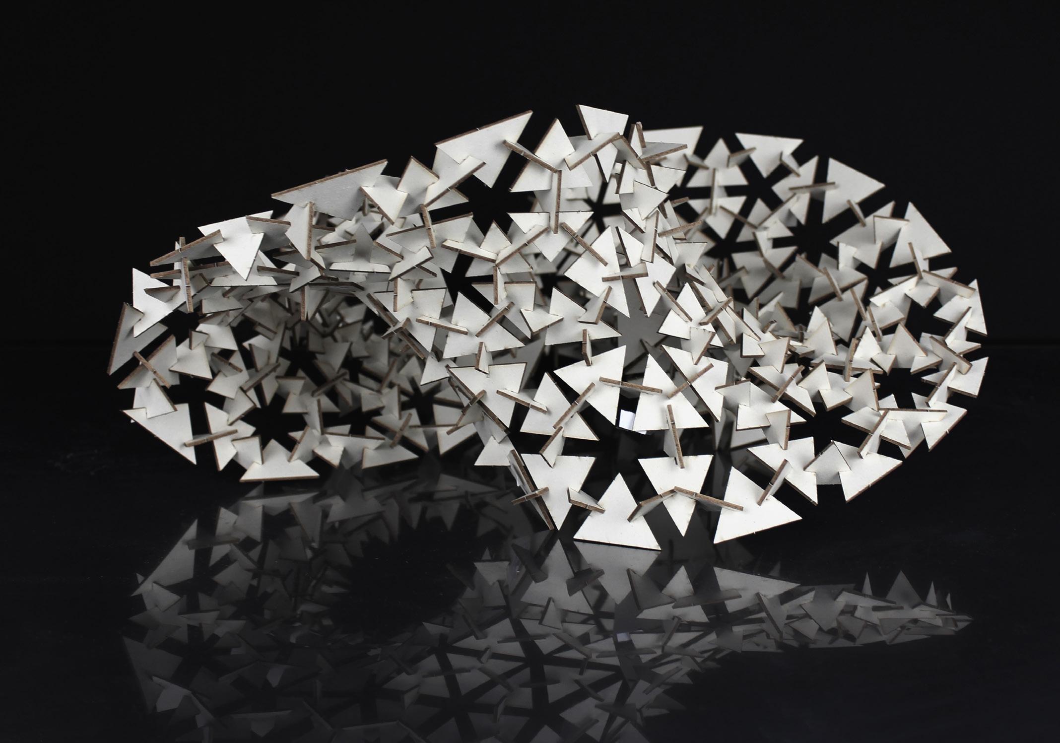 Der gewölbte Holzrahmen stützt die 3D-gedruckte Schale, insbesondere an der Stelle, an der sich die drei separaten Module treffen