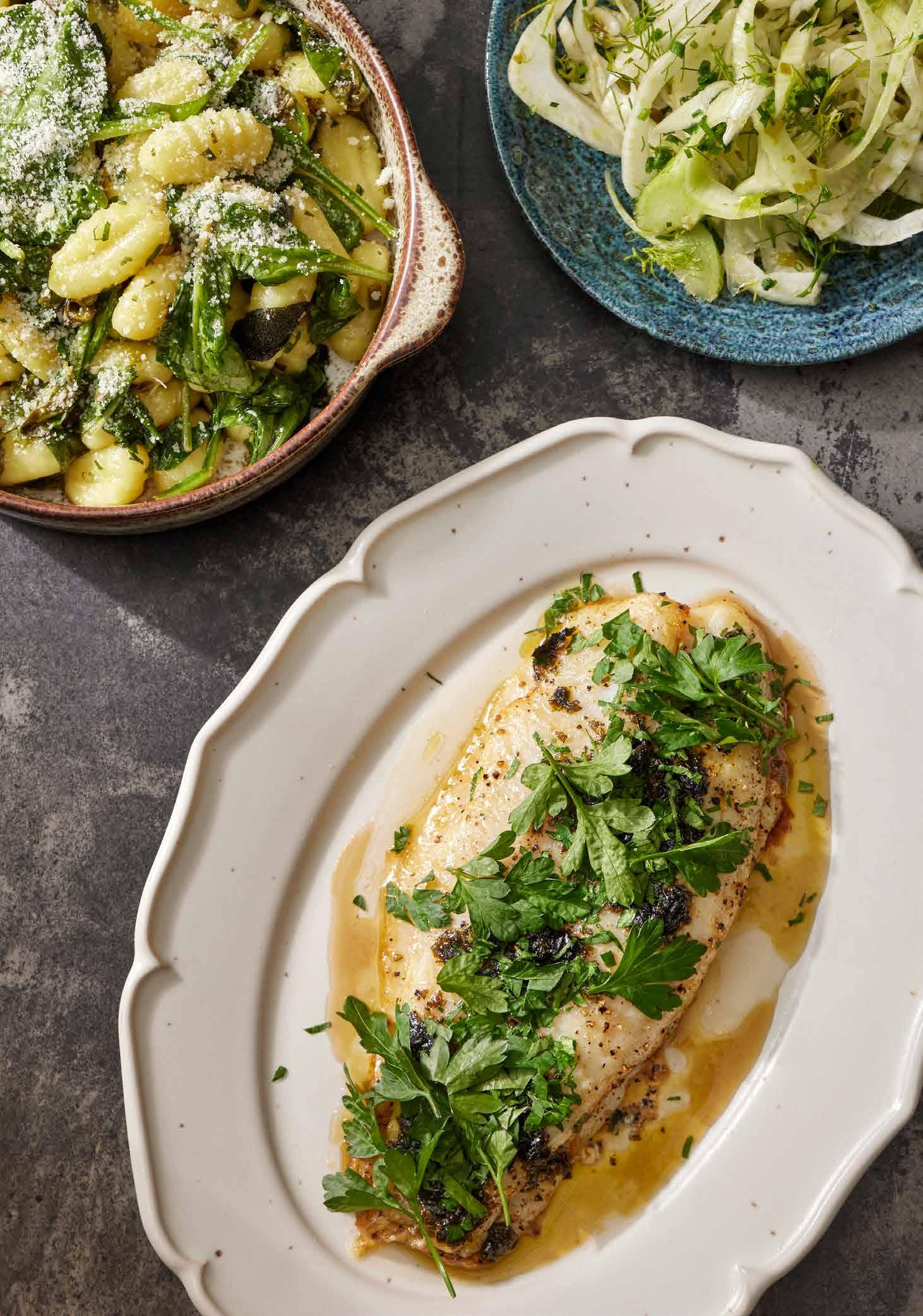 32 / Pangasius meuniere ja yrtti-voignocchit sekä fenkoli-kaprissalaatti