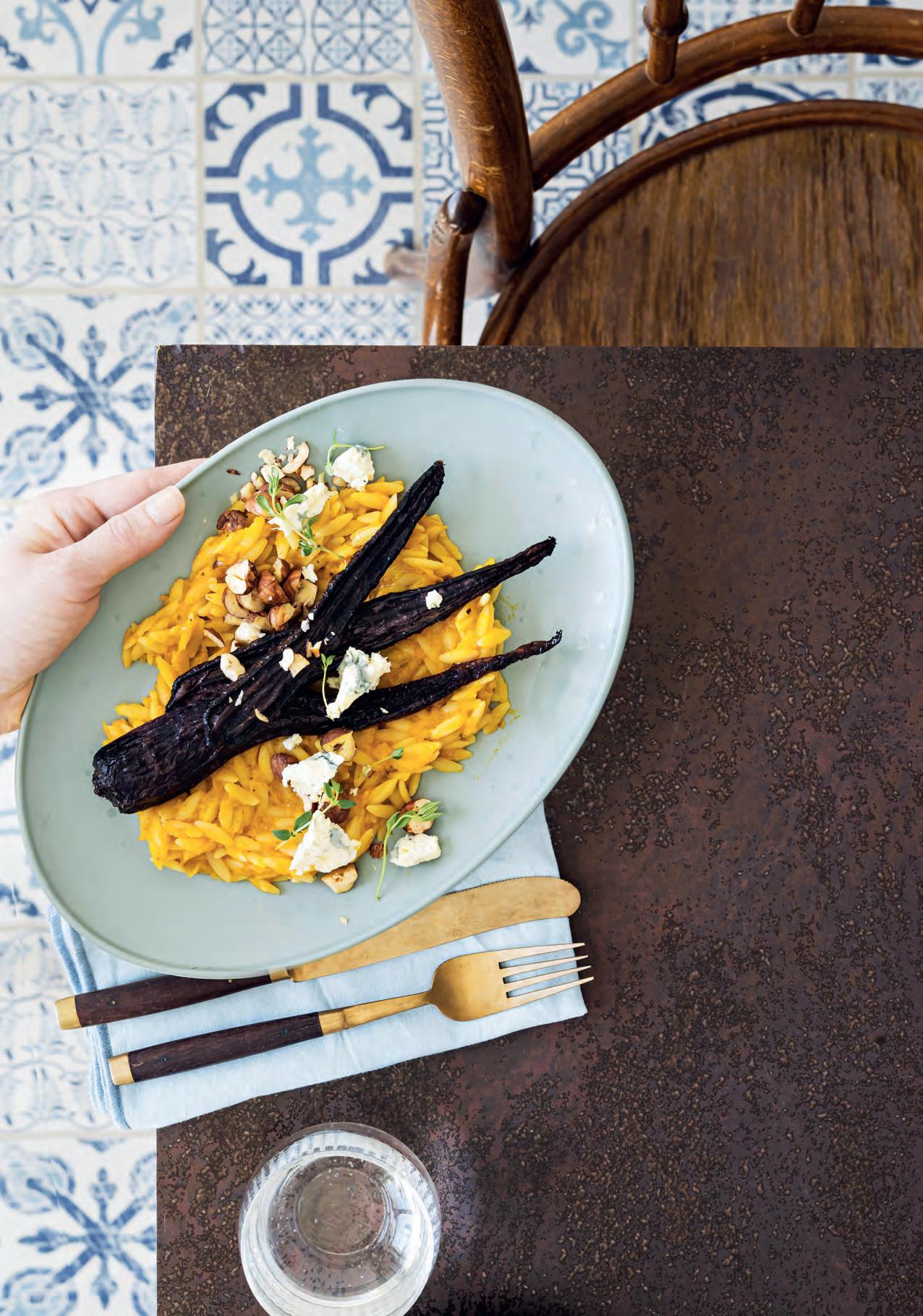4. Rouhi pähkinät ja murusta aurajuusto. 5. Soseuta kurpitsa kuorestaan puristettujen valkosipulin kynsien kanssa. Lisää voi ja suola. Sekoita kypsä orzo kurpitsan joukkoon.