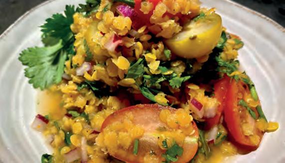 Sekoita kulhossa ensin Pico de Gallo -marinadin kanssa kypsennetyt linssit. Lisää kirsikkatomaatit ja sekoita varovasti käännellen.