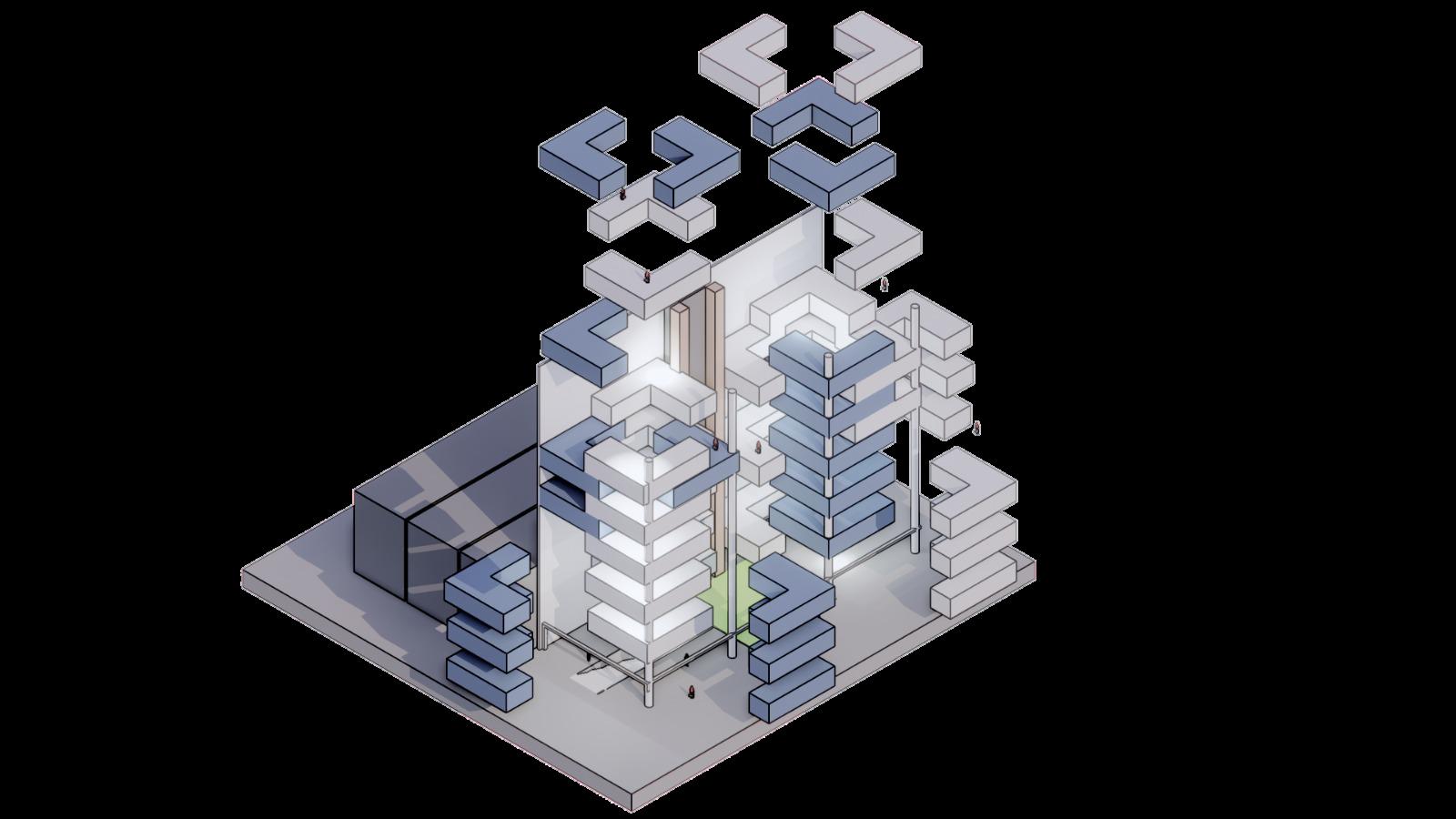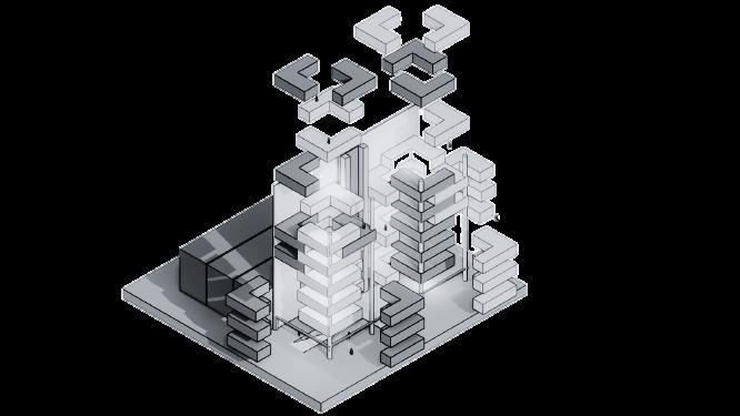 Tomamos el desorden como como elemento por lo que significa el distrito; caos, creando asi multiples figuras ortogonales pero con distintas medidas y posiciones