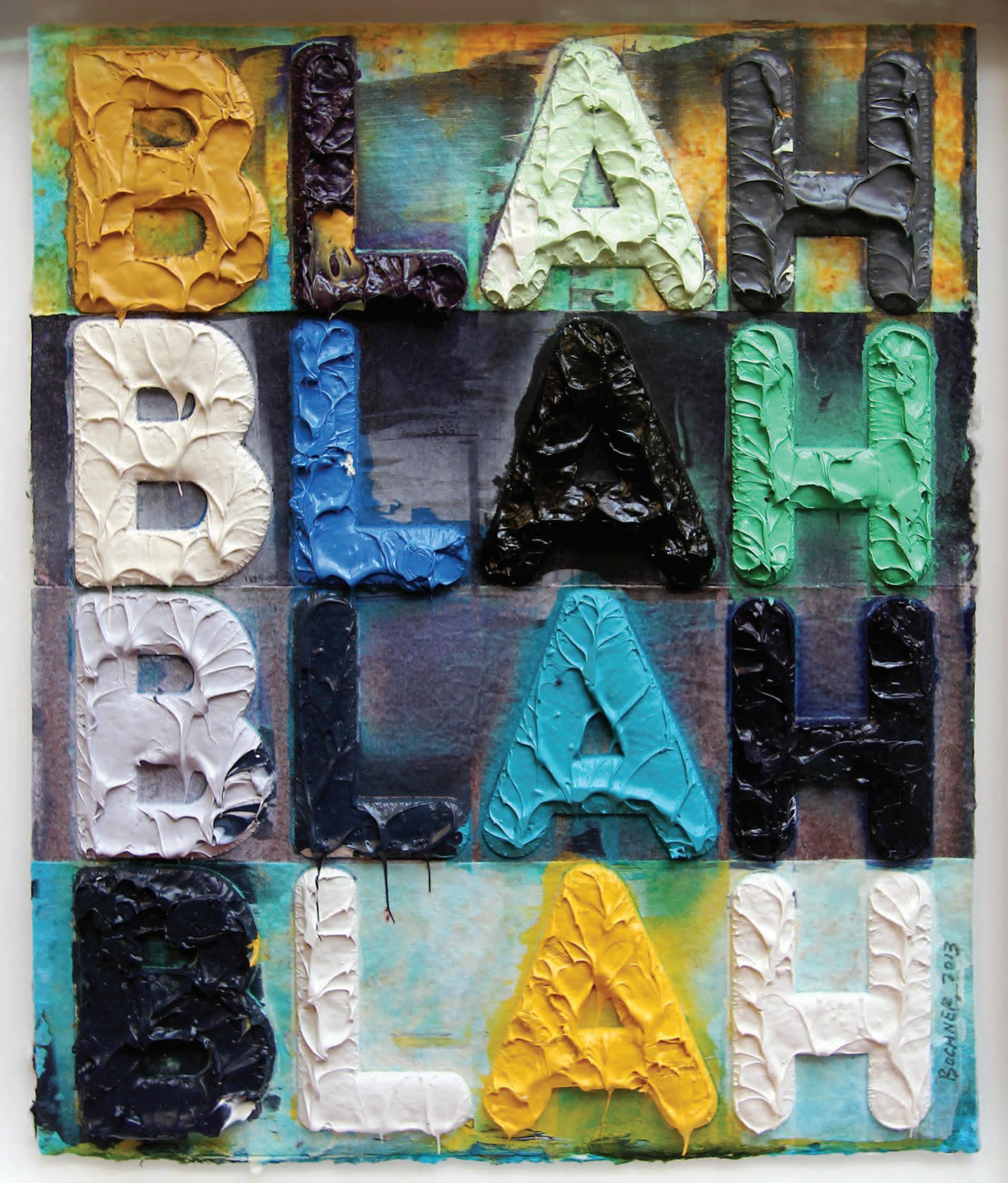 47 BLAH BLAH BLAH, 2014 M ONOPR I NT W I TH C O LL A G E , EN G RAV I N G AND EM B OSSMENT ON HAND DYED T W I NRO C KER HANDMADE PAPER 11 1/2 X 17 I N C HES SIG NED AND DATED ‘14 AT UPPER L EFT P ROVENANCE : GA L ER I E D E BE LL EFEU ILL E , M ONTREA L MEL B O C HNER A MER IC AN , B. 1940