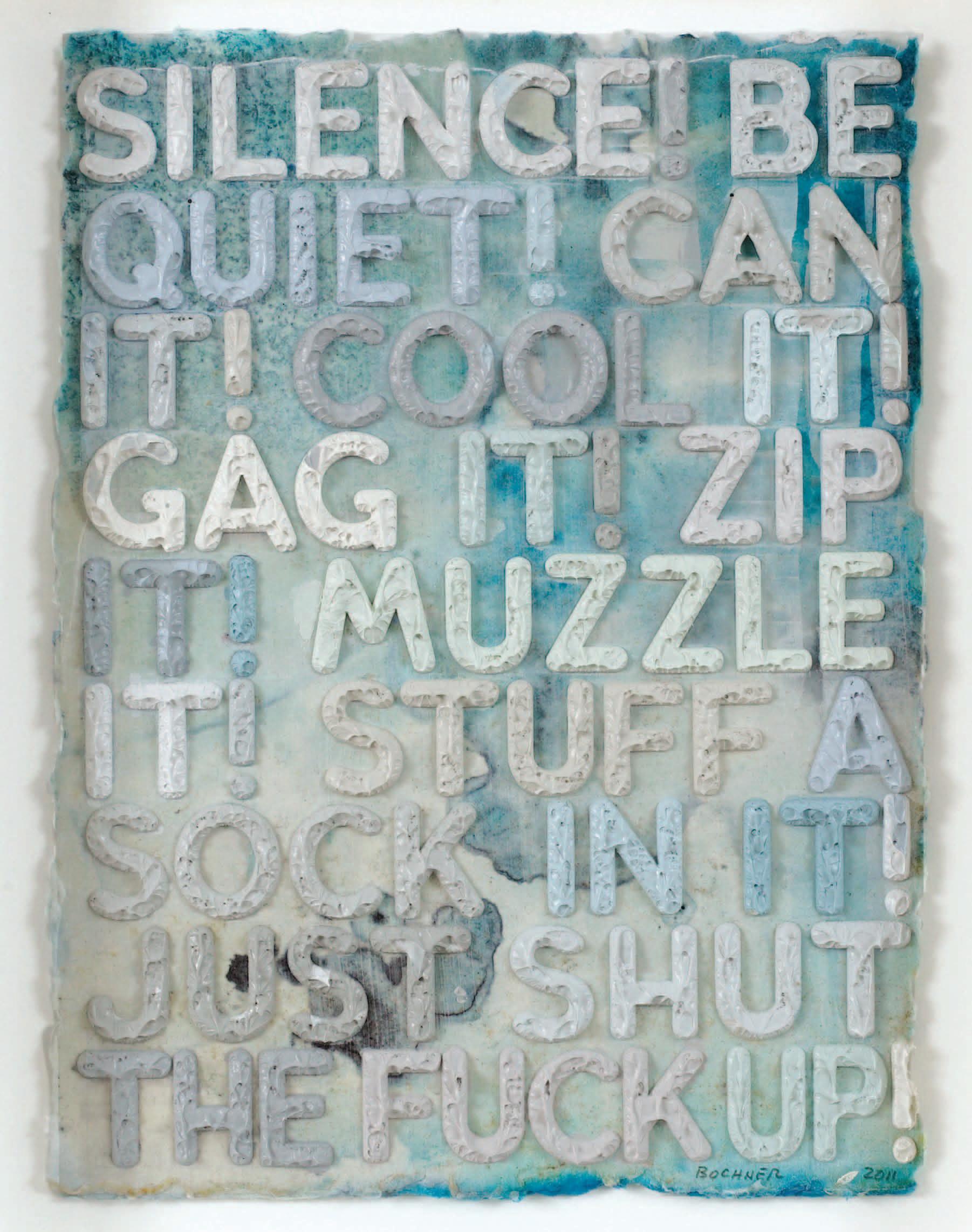 25 BLAH BLAH BLAH, 2013 M ONOPR I NT W I TH C O LL A G E , EN G RAV I N G AND EM B OSSMENT ON HAND DYED T W I NRO C KER HANDMADE PAPER 11 7/8 X 9 3/4 I N C HES SIG NED AND DATED ‘13 AT L OWER R IG HT P ROVENANCE : BAR B ARA K RAKOW GA LL ERY O PP O S ITE PAGE S ILENCE, 2011 M ONOPR I NT W I TH C O LL A G E , EN G RAV I N G AND EM B OSSMENT ON HAND DYED , HANDMADE T W I NRO C KER PAPER 12 X 9 I N C HES SIG NED AND DATED 2011 AT L OWER R IG HT P ROVENANCE : QU I NT GA LL ERY, LA J O LL A , C A P R I VATE CO LL E C T I ON , LOS A N G E L ES , C A