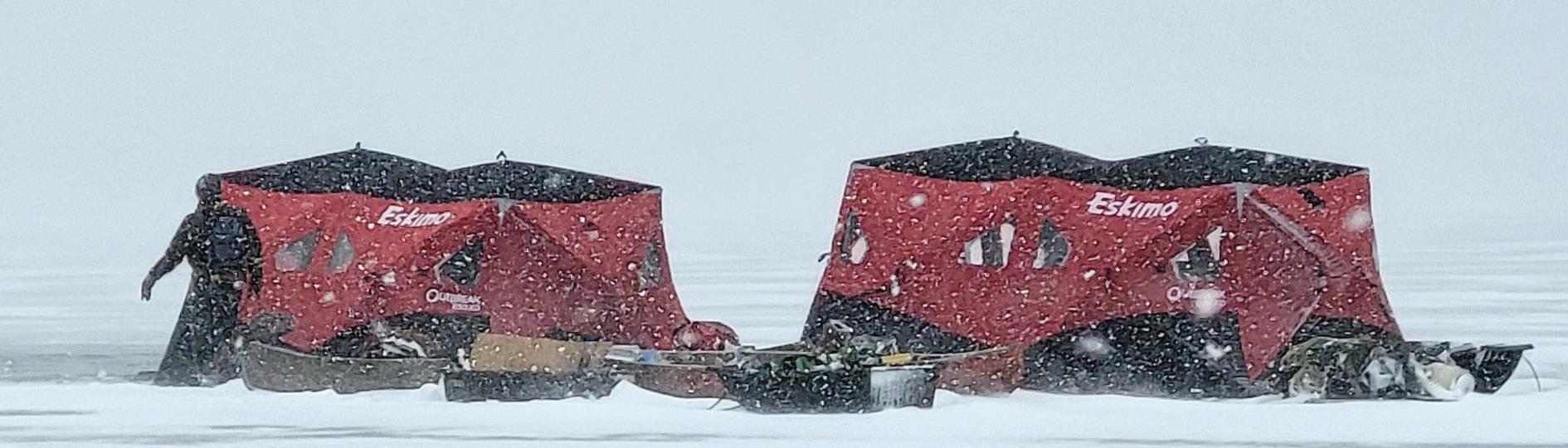 We chose the west side of Center Reef which was a solid 2-mile trek and incredibly physical. Second challenge, a north wind of sustained 20 miles per hour with gusts much stronger blew in lake effect snow from nearby Lake Superior and it was nasty with a capital N. We each put out 3 tip ups and went to work setting up two Eskimo ice shacks and rigging them with propane lights, heat, and a kitchen, along with 3 cots which my pups Ruby and Red (who is probably pregnant) really enjoyed once we laid sleeping bags on them.