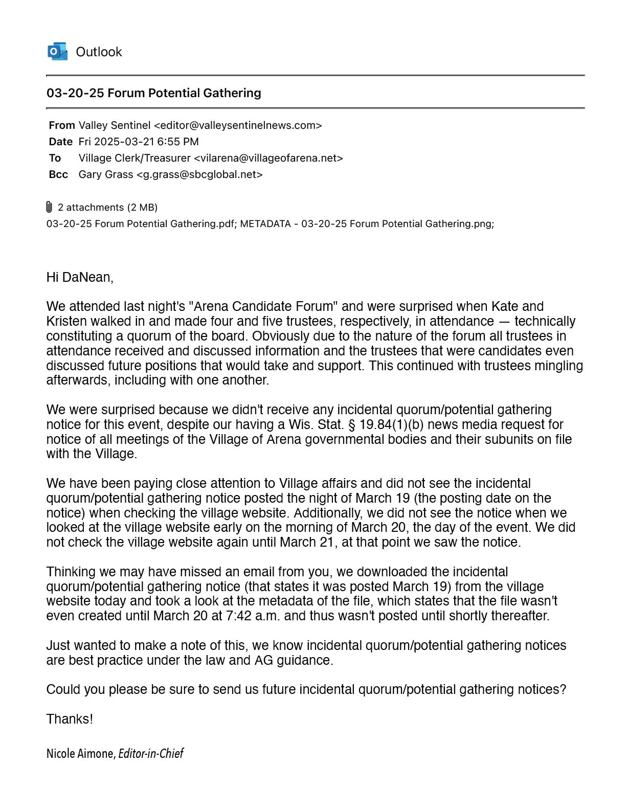 We wanted to ask a few questions quick about the special meeting Oct. 16. We are not asking that any content of the meeting itself be divulged, but rather if the discussion in closed session remained within the scope of the notice. Under Wis. Stat. § 19.85(1). the governmental body must limit its discussion in closed session to the business specified in the announcement. We're reaching out to you two as you voted against the potentially illegal closed session and absolved yourselves of personal liability. Please feel free to answer any or all questions as long or as short as you'd like.