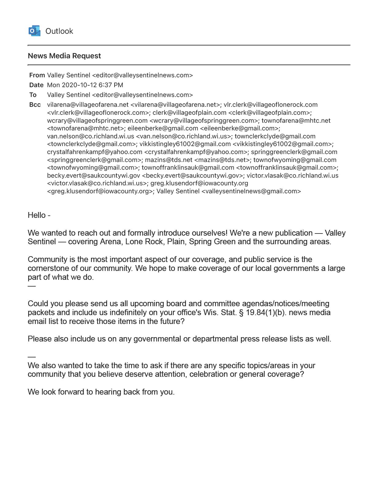 8 This notice to Valley Sentinel — as news media that has requested notice — is required for meetings to be considered properly noticed. When news media request notice under Wis. Stat. 19.84(1)(b) it is separate from the notice given to the public, but equally as necessary.