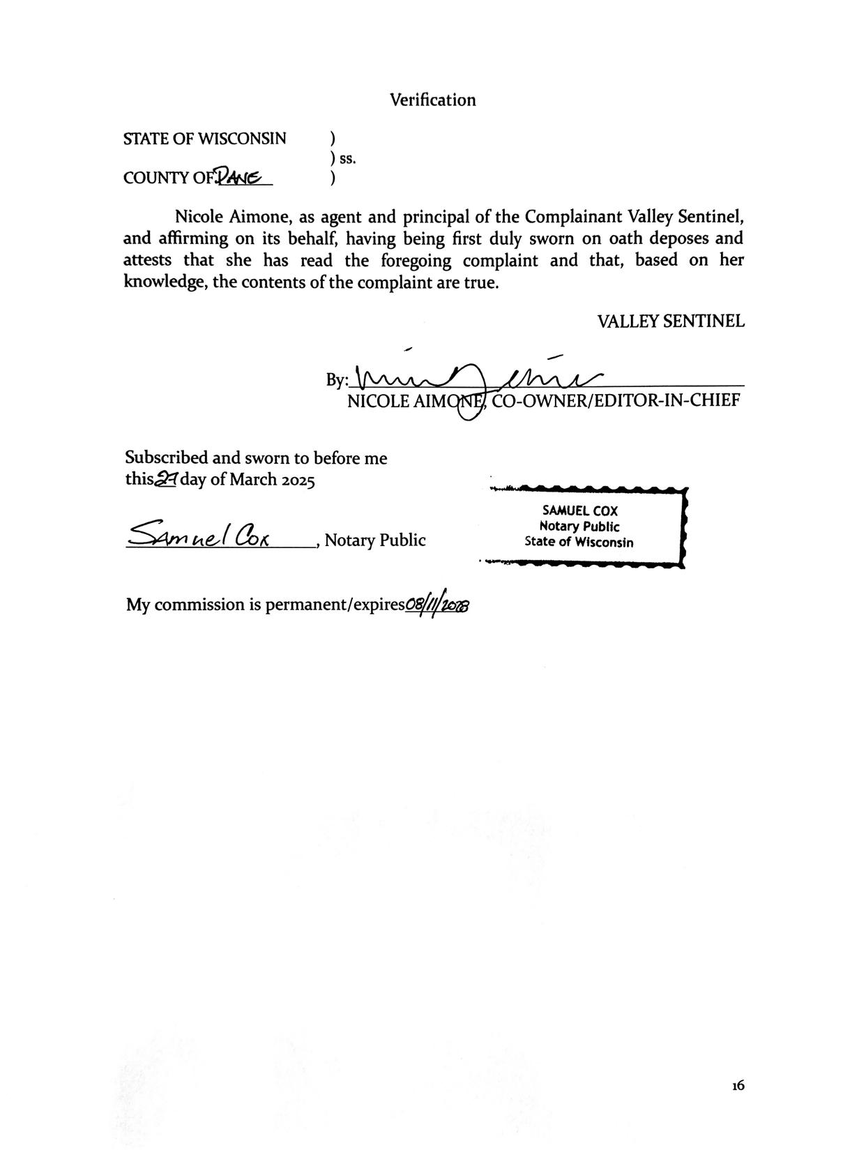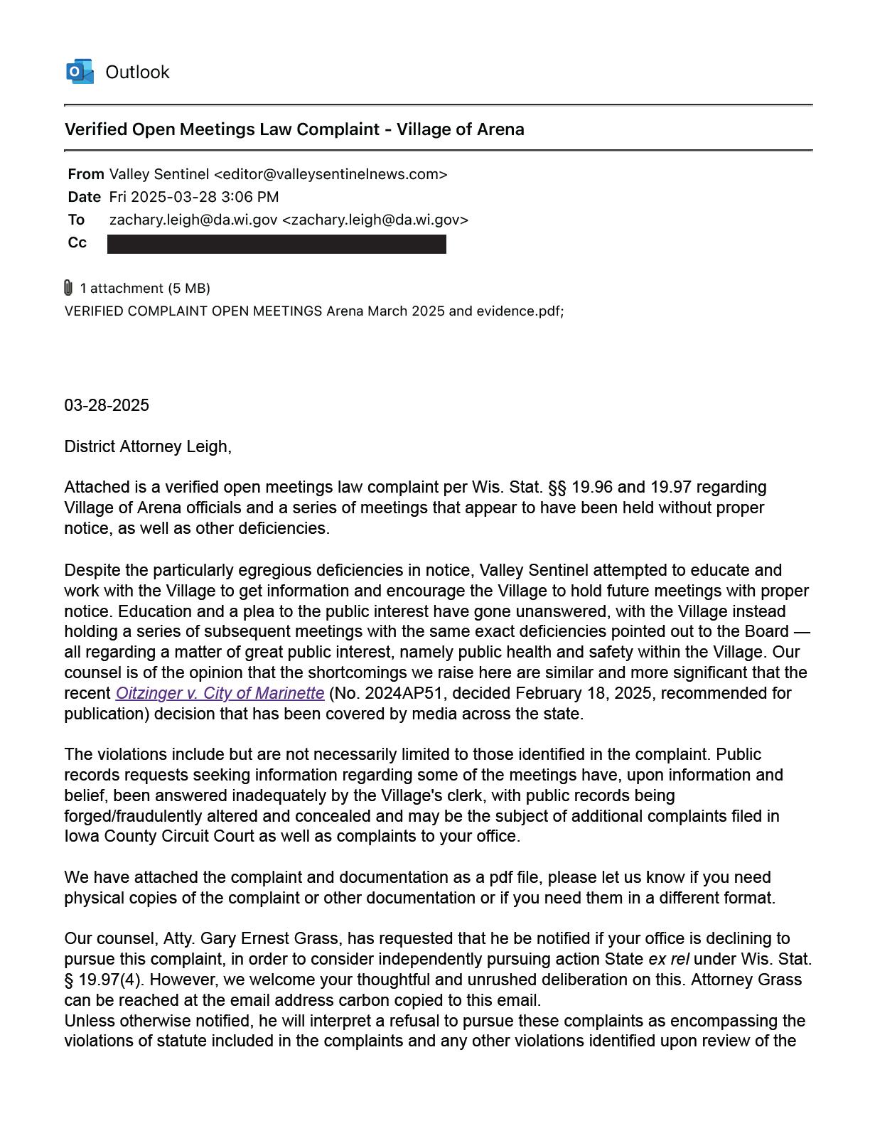The Valley Sentinel (hereinafter also “Complainant”) submits the following to you as a verified complaint pursuant to Wis. Stat. § 19.97 against the Village of Arena in Iowa County, Wisconsin; its Village Board of Trustees; its Finance Committee, Village President Kate Reimann; Trustees Kathy Stoltz, Melissa Bandell, Kristen Shea, and Brittany Carney; and Village of Arena Clerk/Treasurer DaNean Naeger (hereinafter collectively “Respondents”). Trustees Becca Raven Uminowicz and MatthewSchroederaredeliberatelyomittedasrespondents for reasons explained below. In support of the Complaint, the Valley Sentinel states:
