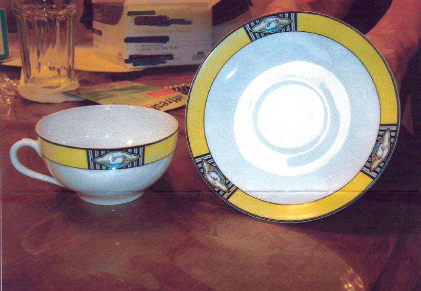 Q: This porcelain cup and saucer were “prizes” inside a tin can of “White Swan Coffee” in 1926. On the bottom of each piece is the letter “M” in a wreath and the words “Noritake -- Made in Japan -- U.S. Design PT. Pending.”