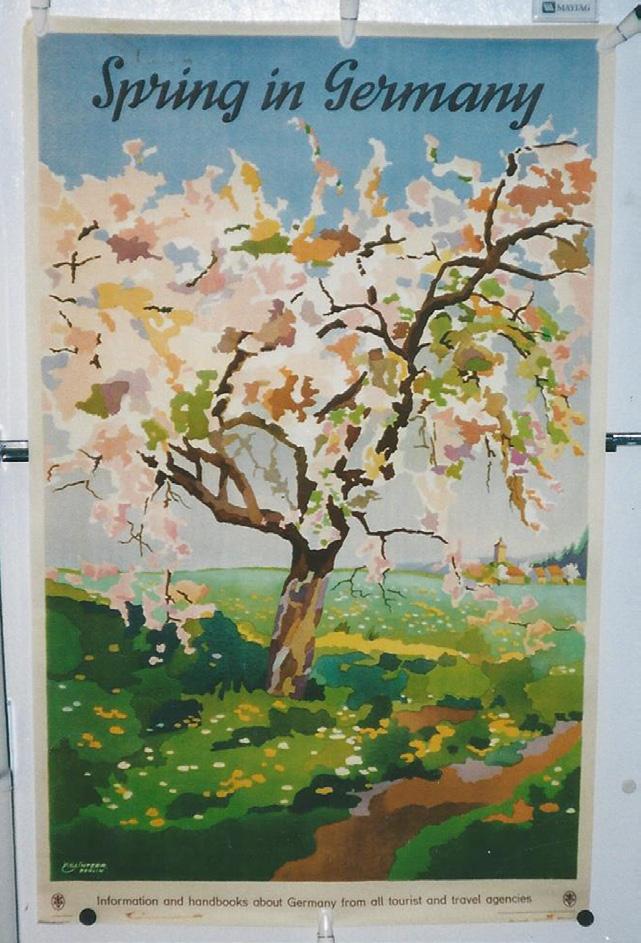 The original scene, “Spring in Germany,” was made around 1935 by artist and graphic designer Emmy Glintzer. She studied art in Berlin and became a design consultant for the German Postal System. Many pieces of her art were lost in the bombing during World War II. She lived from 1901 to 1992. The letters “R - D - V” are the logo for the Reichsbahn-