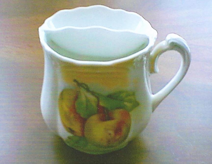 It is porcelain and half the opening of the cup is covered with three holes. The cup is decorated with fruit and leaves, all against a white background. Marked on the bottom are the word “Germany” and number “168.” It is in perfect condition.