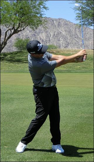 2. The wrists are free to hinge and re-hinge. The hands and wrists play a critical role to swinging the club with speed and repeatability. The left thumb is basically pointing up and slightly behind the player at each point.