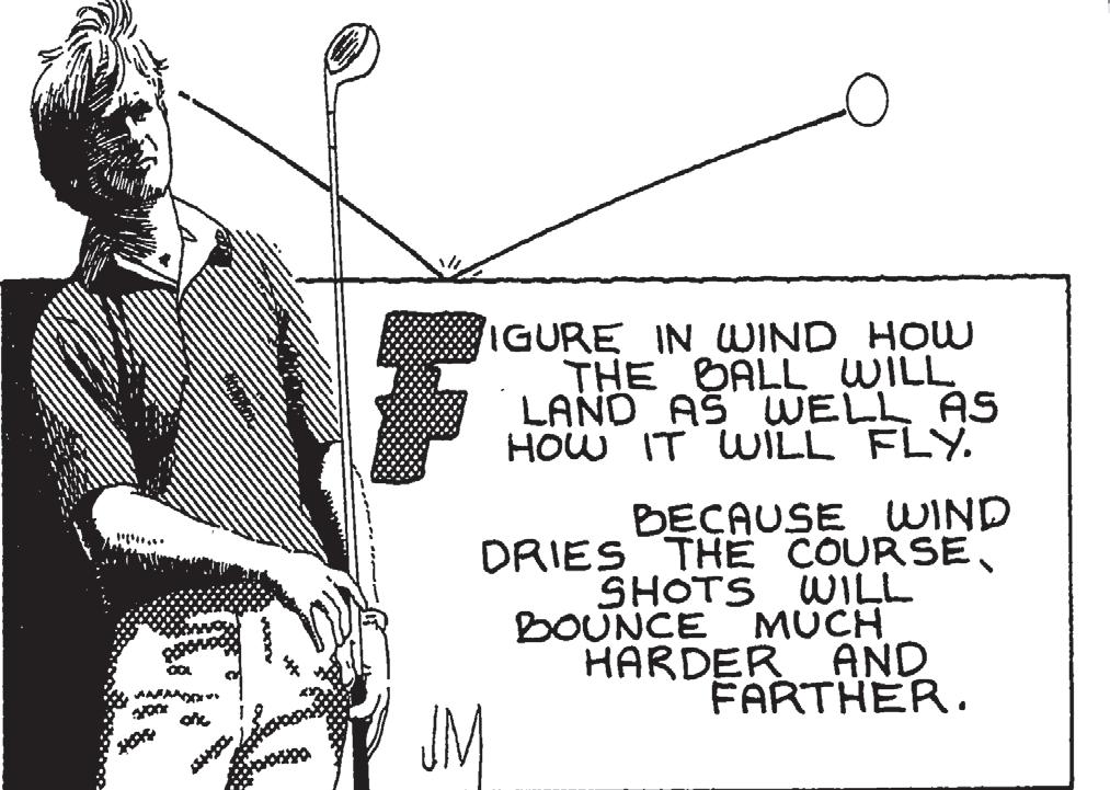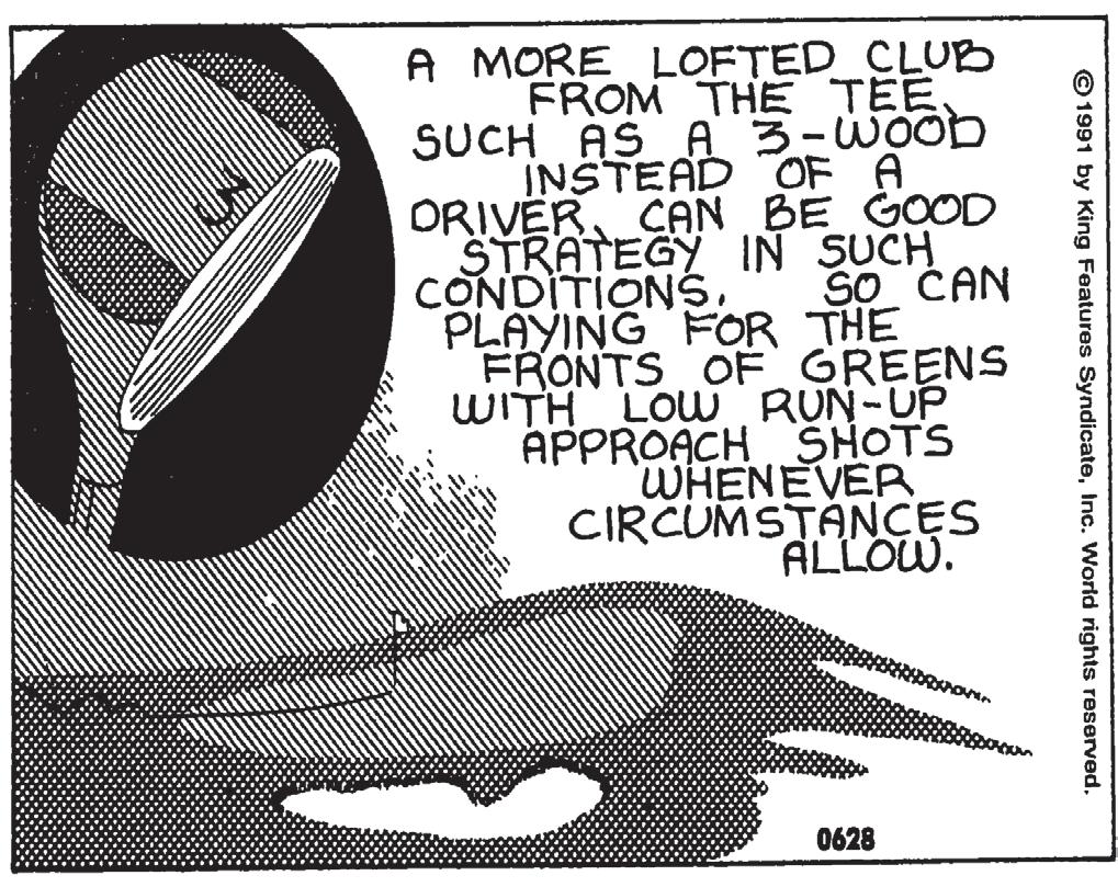 "Actually, I think you can forget about the driver altogether and just tap it off with the putter. That fairway is 75 feet straight down and it looks like it slopes toward the green."