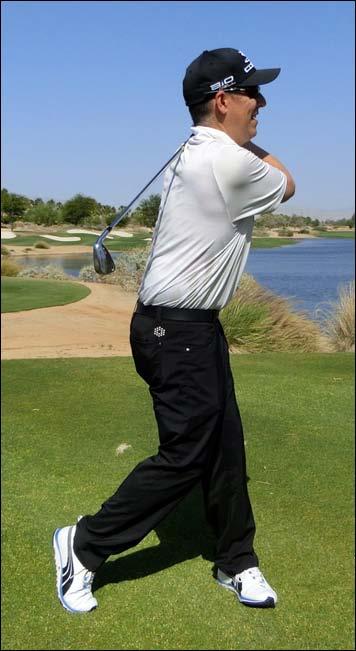 A good finish should have the left leg straight, the right thigh up close to the left leg, the right foot up on the toe, and the upper body arching back slightly. The trick is that the hips are now “tucked under” the upper body or the stomach is pushed forward. Many beginners, or players who don’t have good core strength, will finish with their hips pushed out behind their upper body. Learn to correct the finish by tucking the hips under or pushing your belt buckle forward in order to feel the correct position. Good leg work will assist in correct hip positioning as well.